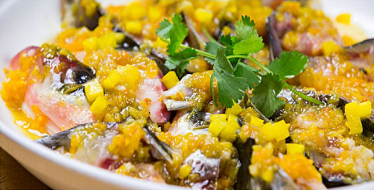 Steamed Fish with Sauce | ["fish","sauce","cilantro","mango"] | ["fish:200g","sauce:50g"] | |