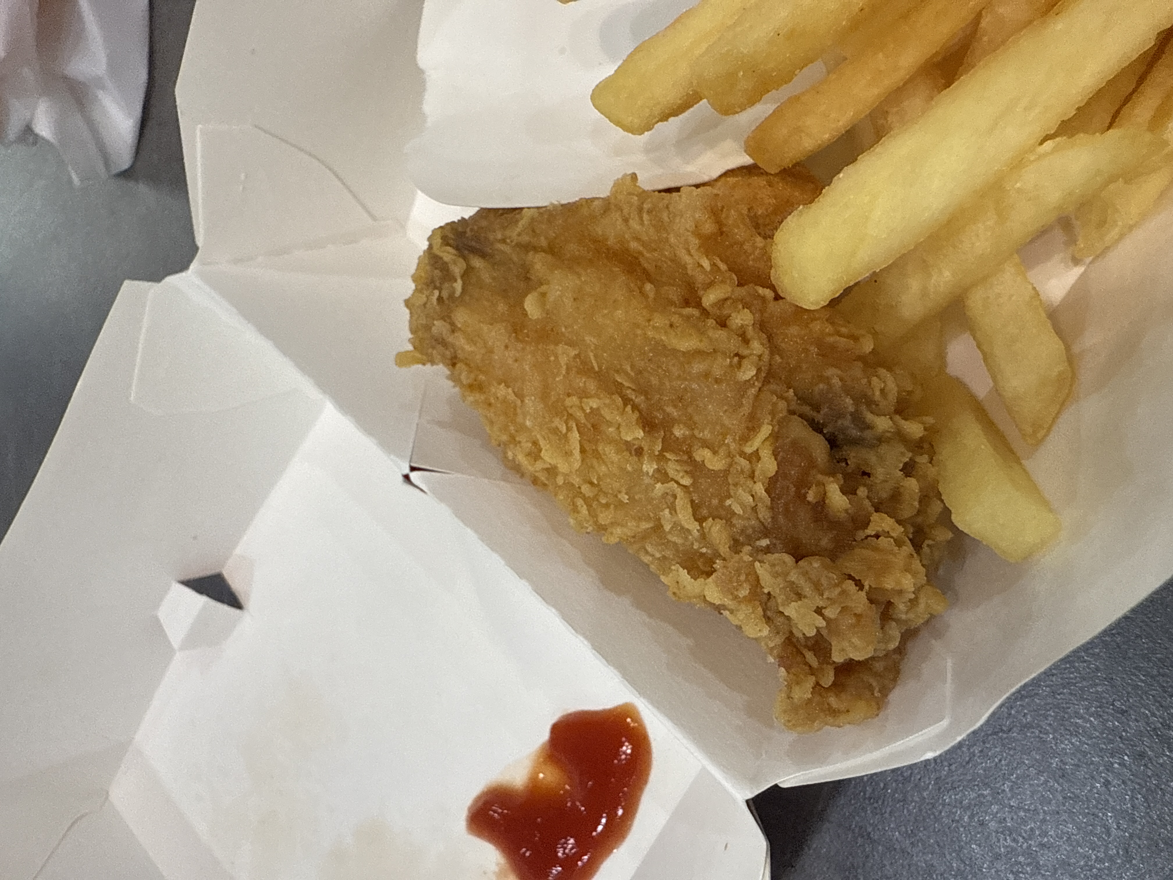 Fried Chicken and Fries | ["fried chicken","potato fries","ketchup"] | ["fried chicken:200g","fries:150g"] | |
