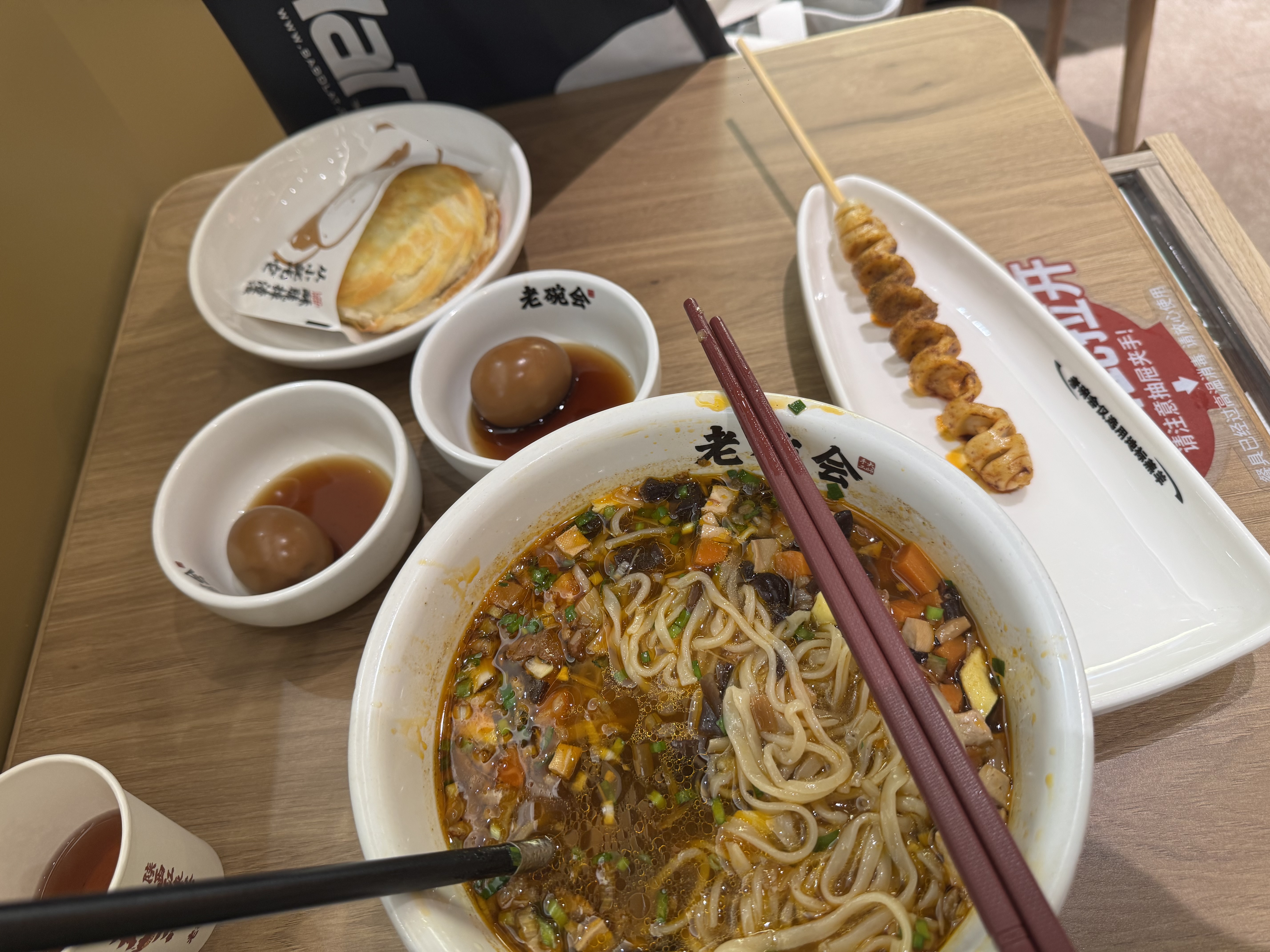 Spicy Noodle Soup | ["noodles","broth","vegetables","eggs","pastry"] | ["noodles:300g","eggs:100g","pastry:100g"] | |