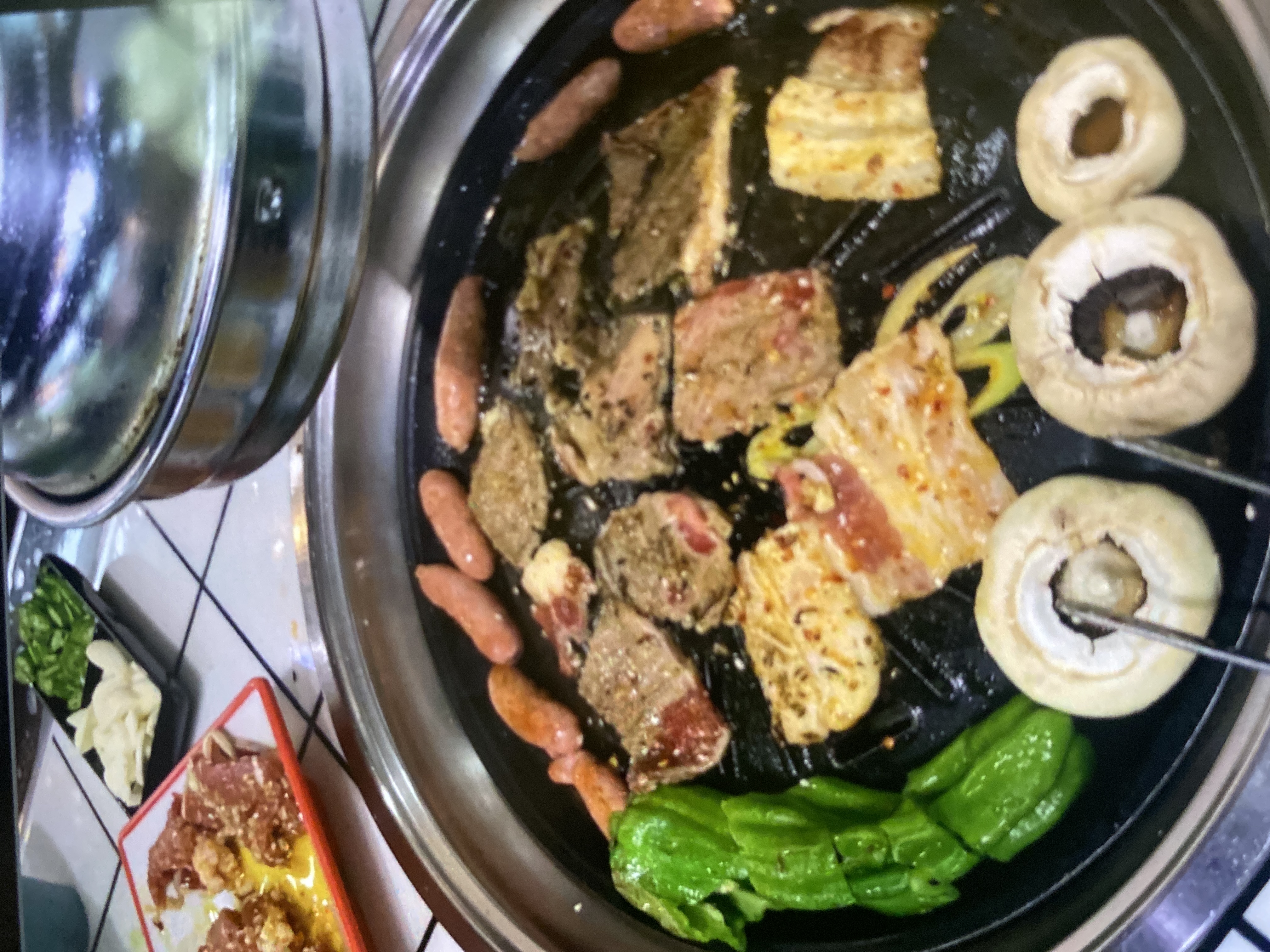Grilled Meat Platter | ["beef","pork","sausages","bell peppers","mushrooms"] | ["beef:200g","pork:150g","sausages:100g","vegetables:100g"] | |