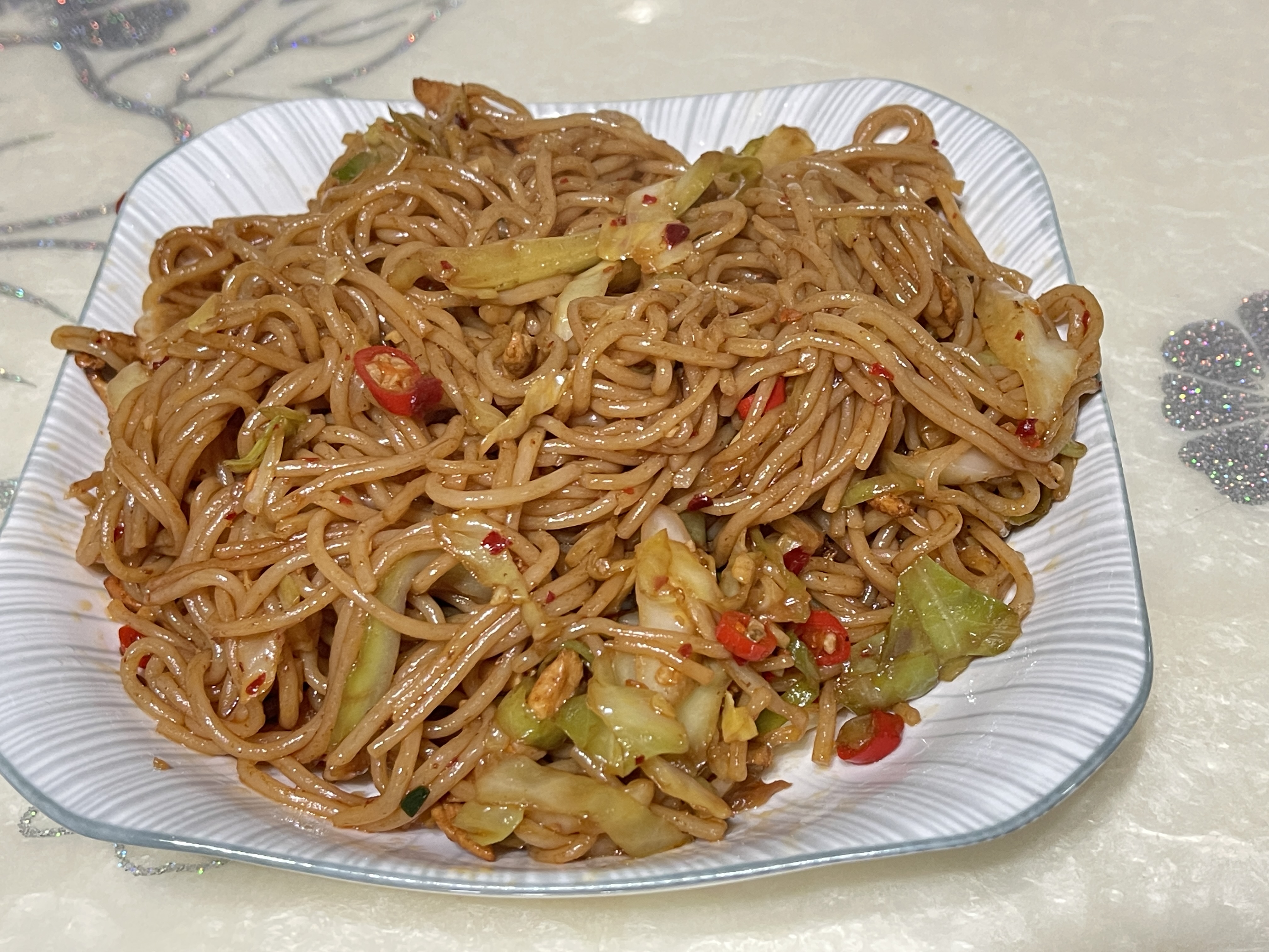 Stir-fried Noodles | ["noodles","cabbage","chili peppers","soy sauce"] | ["noodles:300g","vegetables:50g"] | |