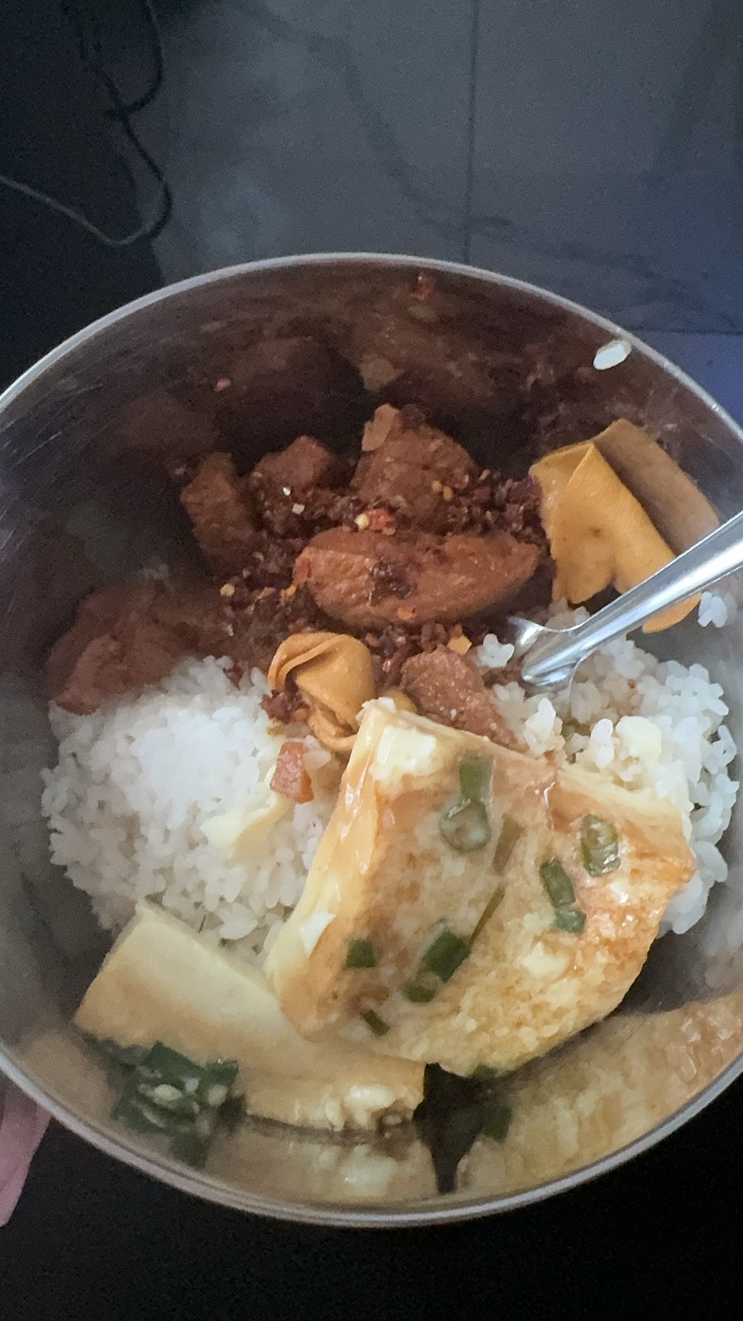 Rice with meat and tofu | ["rice","meat","tofu"] | ["rice:250g","meat:100g","tofu:100g"] | |