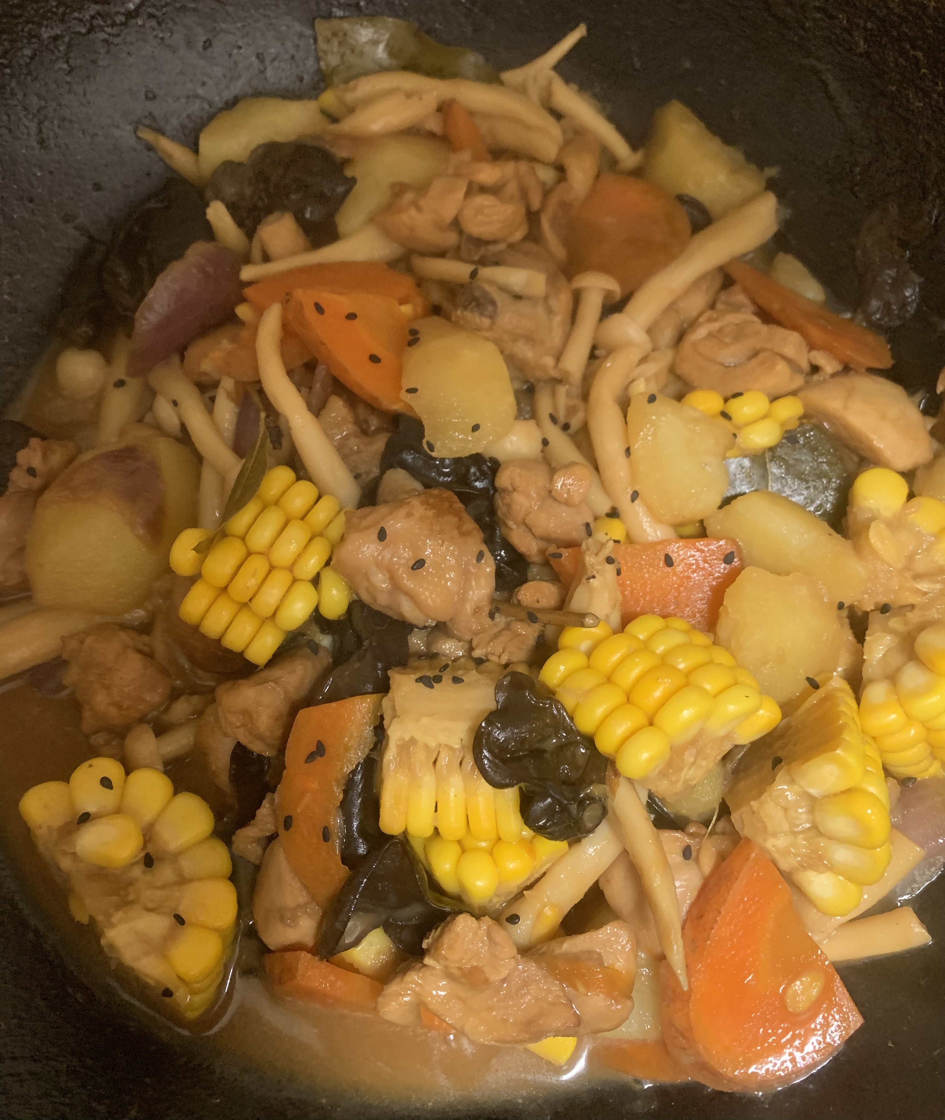 Chicken and Vegetable Stir-Fry | ["chicken","carrots","potatoes","corn","black fungus","seasoning"] | ["chicken:200g","vegetables:150g","corn:100g"] | |
