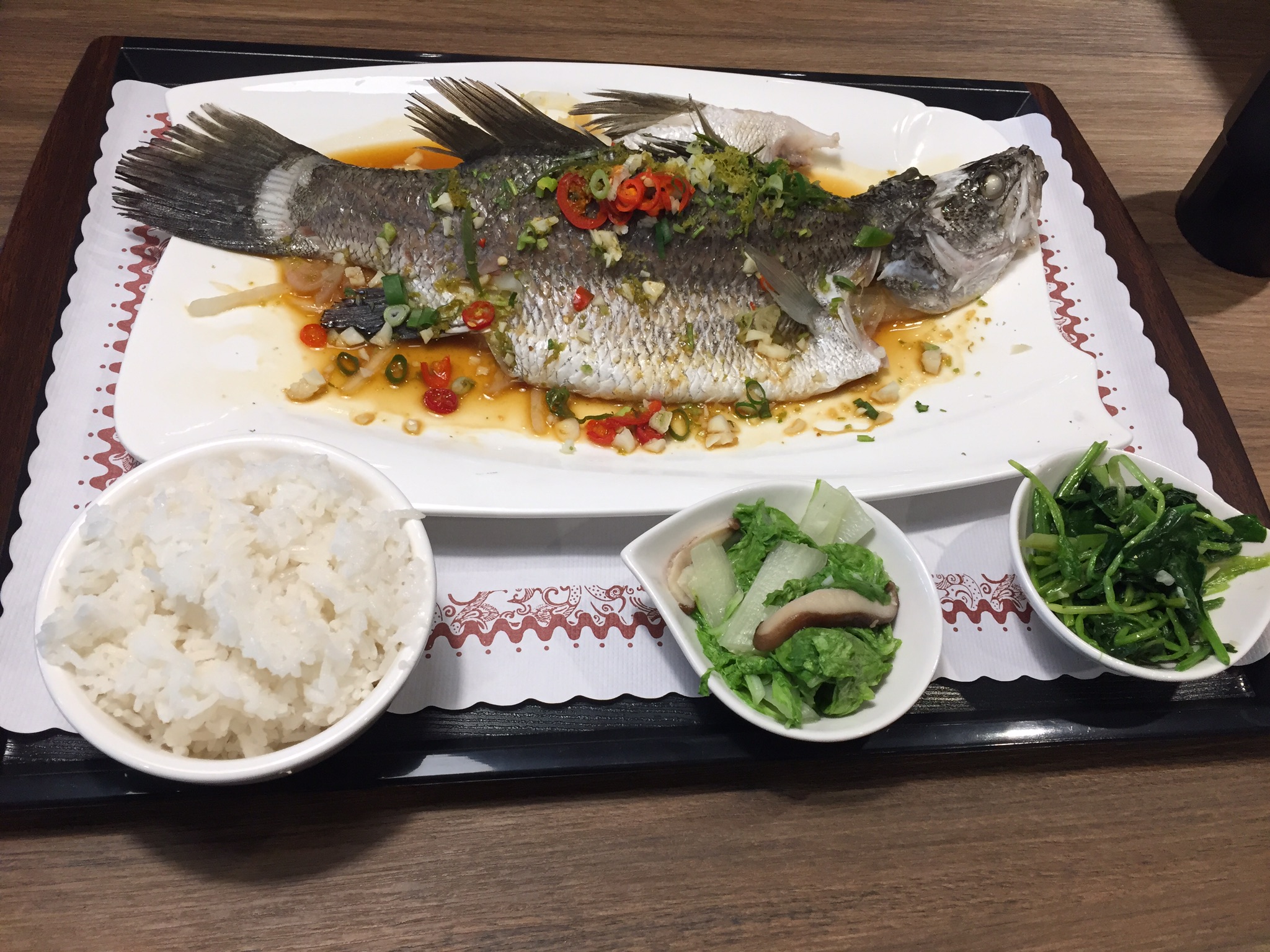 Steamed Fish with Rice | ["fish","rice","vegetables","spices"] | ["fish:300g","rice:150g","vegetables:100g"] | |