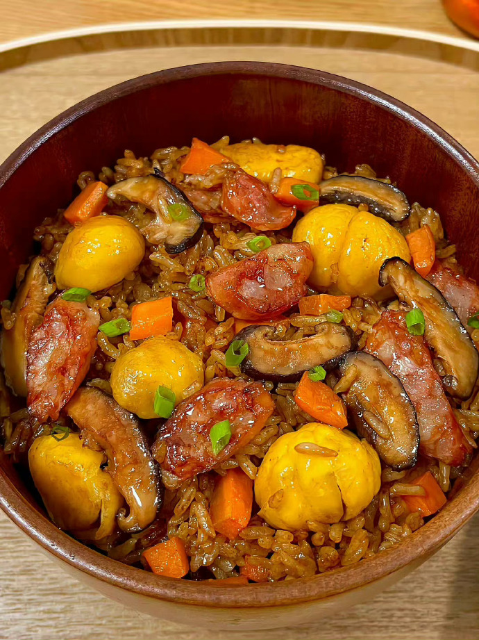 Fried Rice | ["rice","chicken","carrots","mushrooms","chestnuts","green onions"] | ["rice:300g","chicken:100g","vegetables:50g"] | |