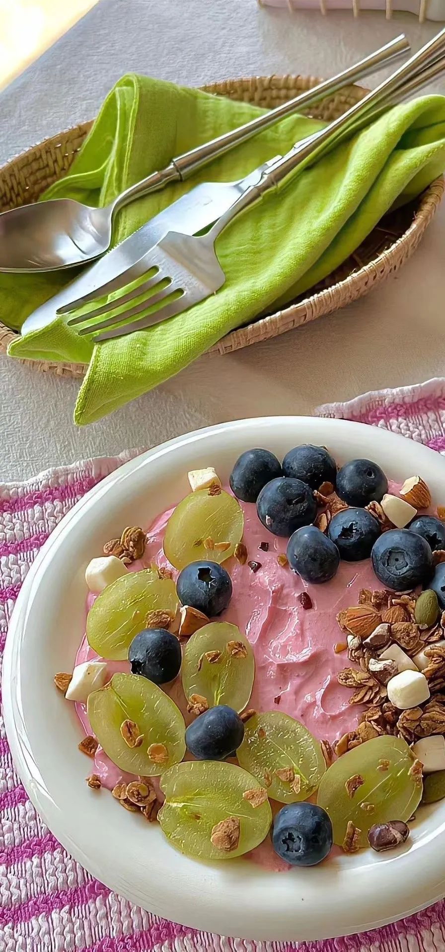 Fruit Yogurt Bowl | ["yogurt","grapes","blueberries","granola"] | ["yogurt:200g","grapes:100g","blueberries:50g","granola:50g"] | |