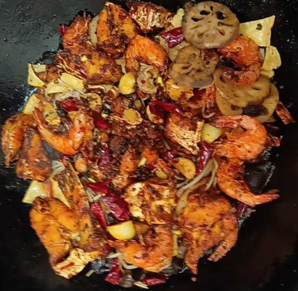 Shrimp Stir-Fry | ["shrimp","lotus root","chili peppers","onions","spices"] | ["shrimp:200g","vegetables:150g","spices:50g"] | |