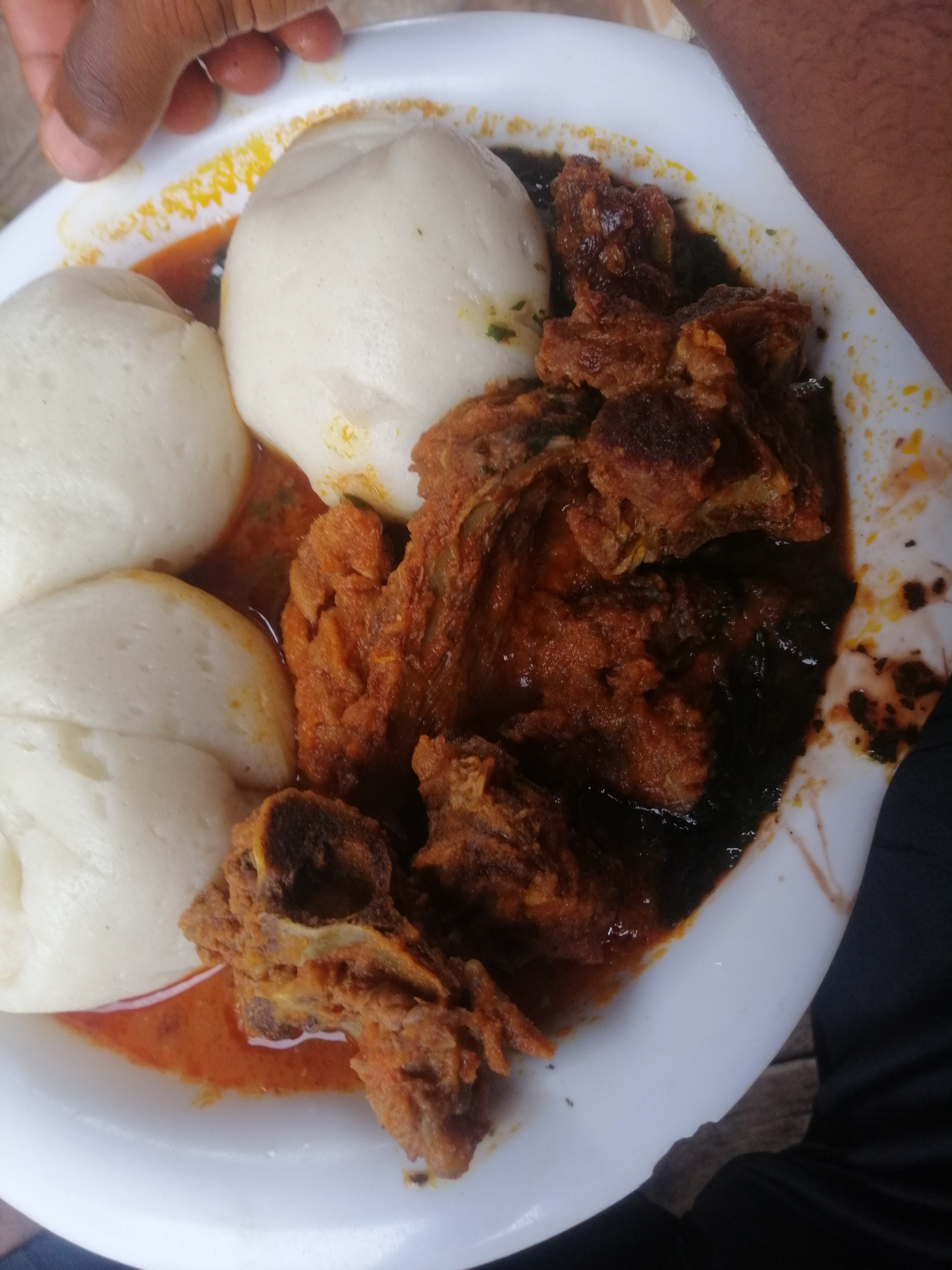 Fufu with meat in sauce | ["fufu","meat","sauce"] | ["fufu:300g","meat:200g","sauce:100g"] | |
