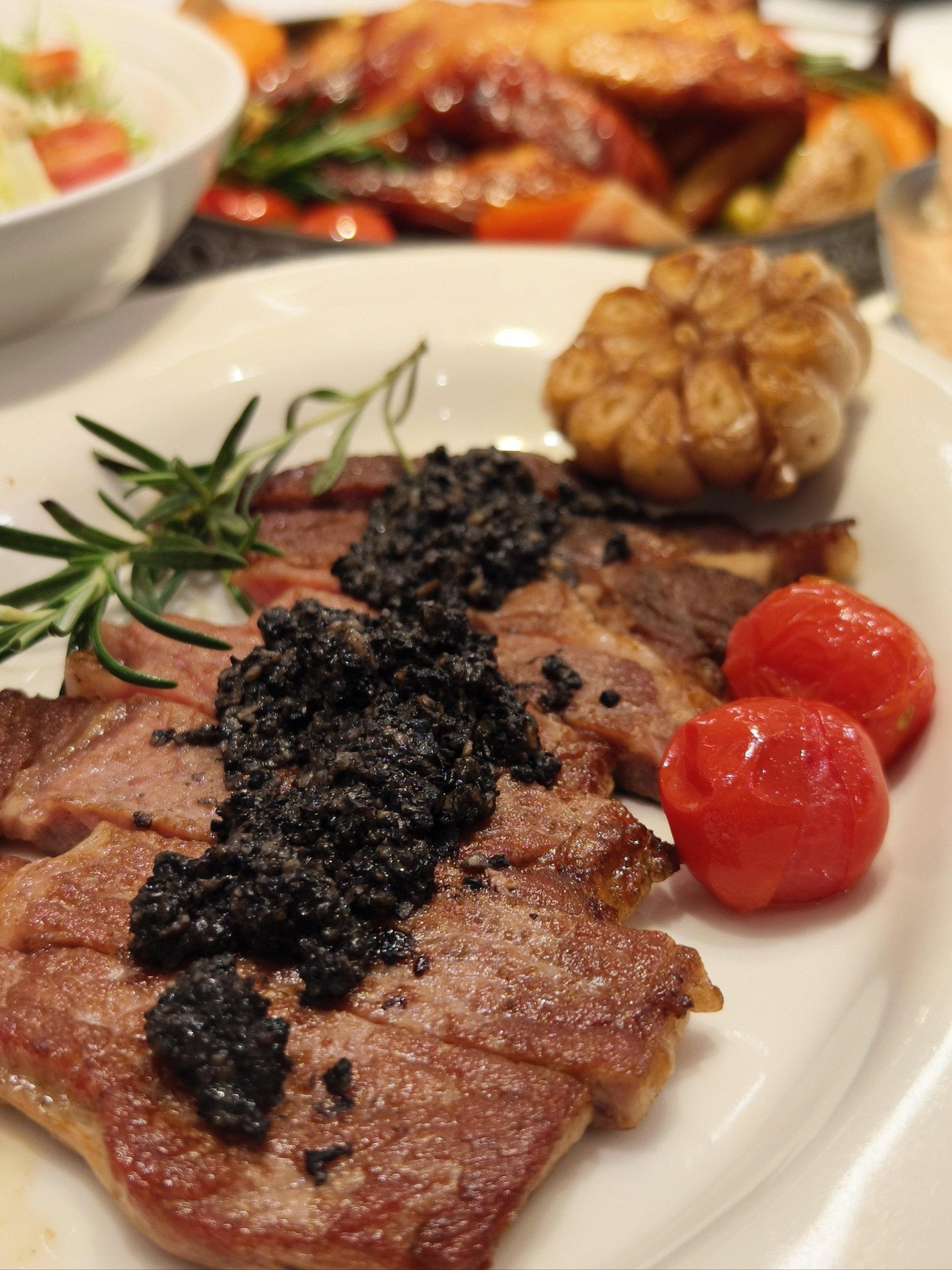 Grilled Steak with Garlic | ["steak","black garlic","tomatoes","rosemary"] | ["steak:250g","garlic:50g","tomatoes:100g"] | |