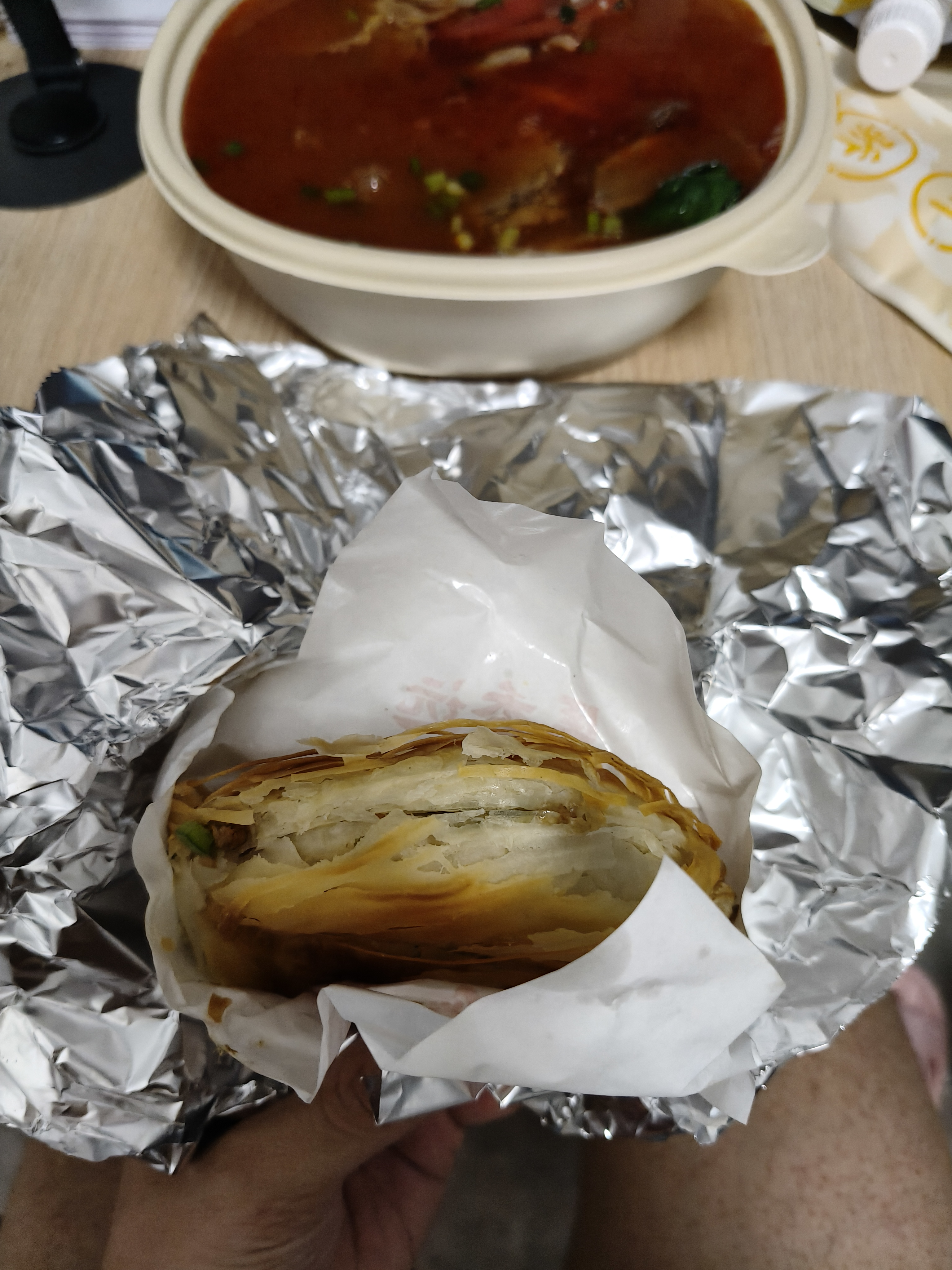 Layered pastry with soup | ["pastry","meat","vegetables","broth"] | ["pastry:200g","soup:300g"] | |