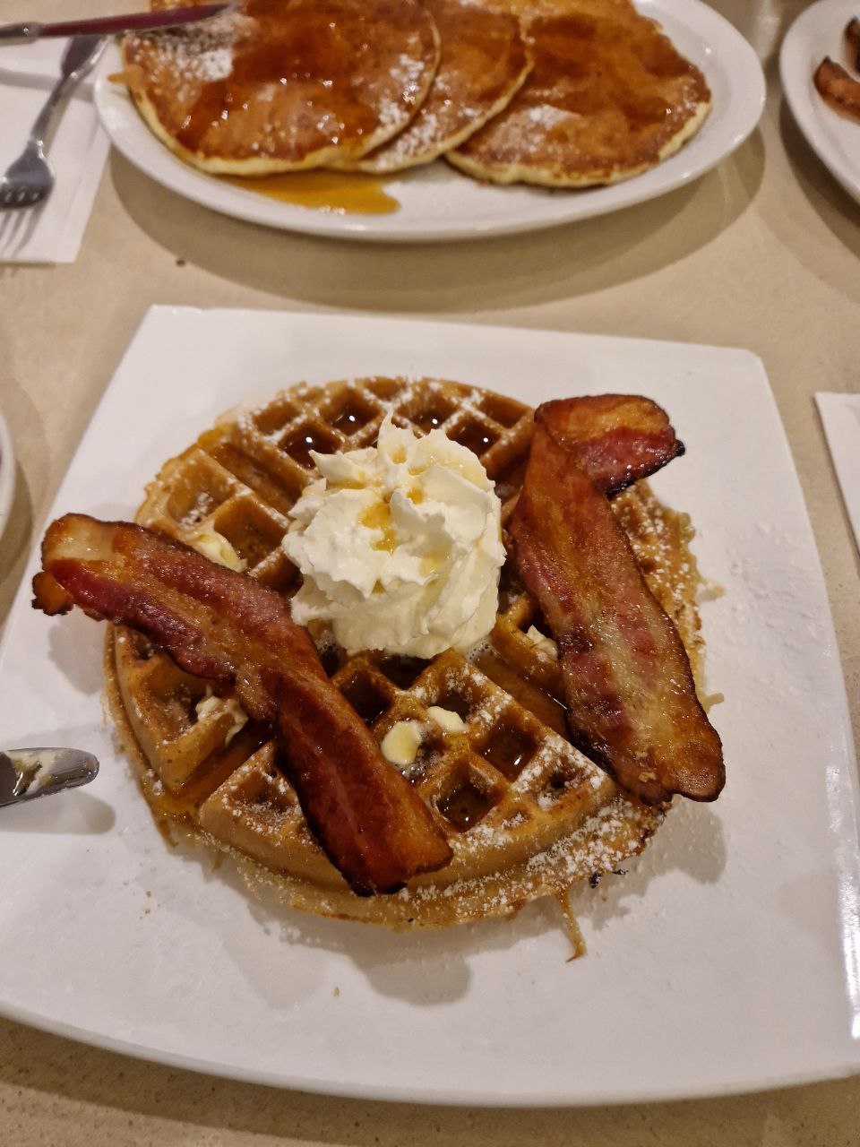 Waffles with Bacon | ["waffle","bacon","whipped cream","maple syrup"] | ["waffle:200g","bacon:50g","whipped cream:30g"] | |