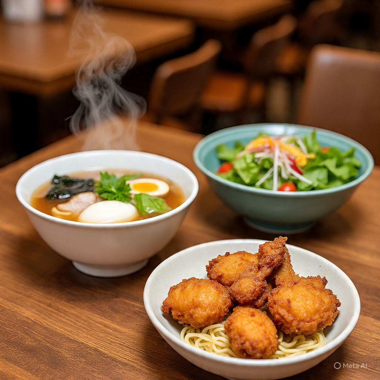 Ramen with Fried Chicken | ["ramen noodles","broth","egg","seaweed","fried chicken","salad greens","tomatoes"] | ["ramen:300g","fried chicken:150g","salad:100g"] | |