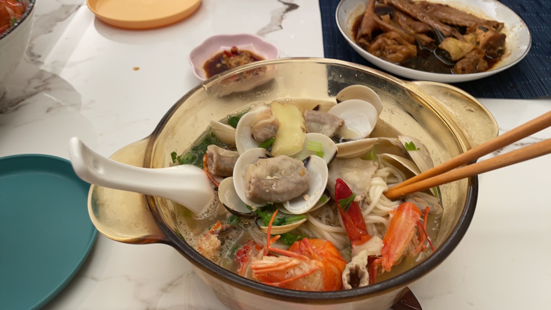 Seafood Noodle Soup | ["shrimp","clams","noodles","ginger","vegetables"] | ["seafood:200g","noodles:150g","vegetables:100g"] | |
