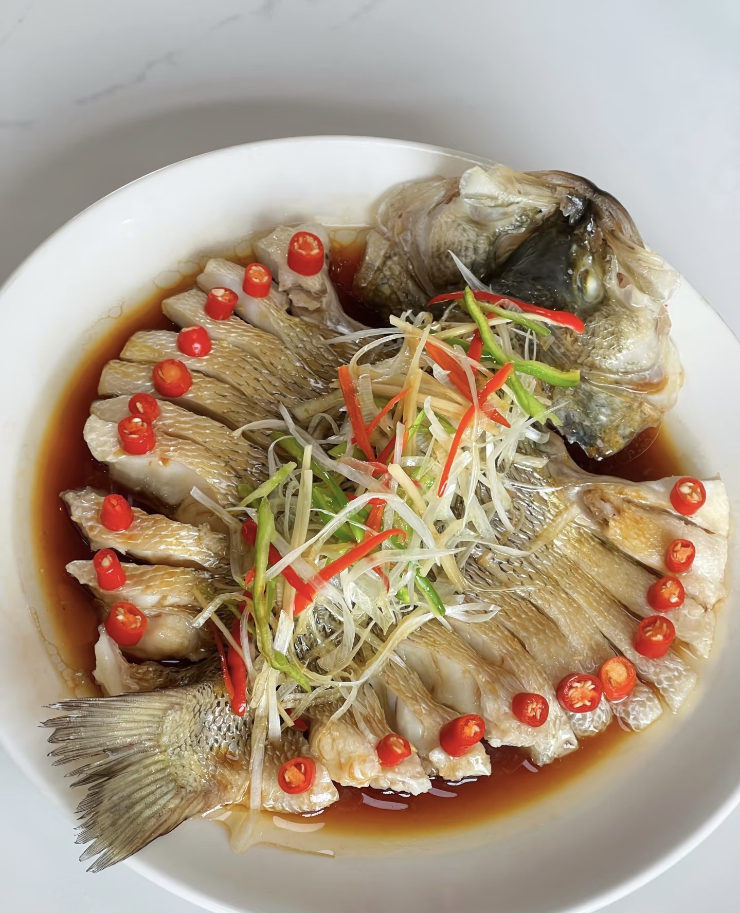 Steamed Fish | ["fish","ginger","chili","soy sauce"] | ["fish:300g","sauce:50g"] | |