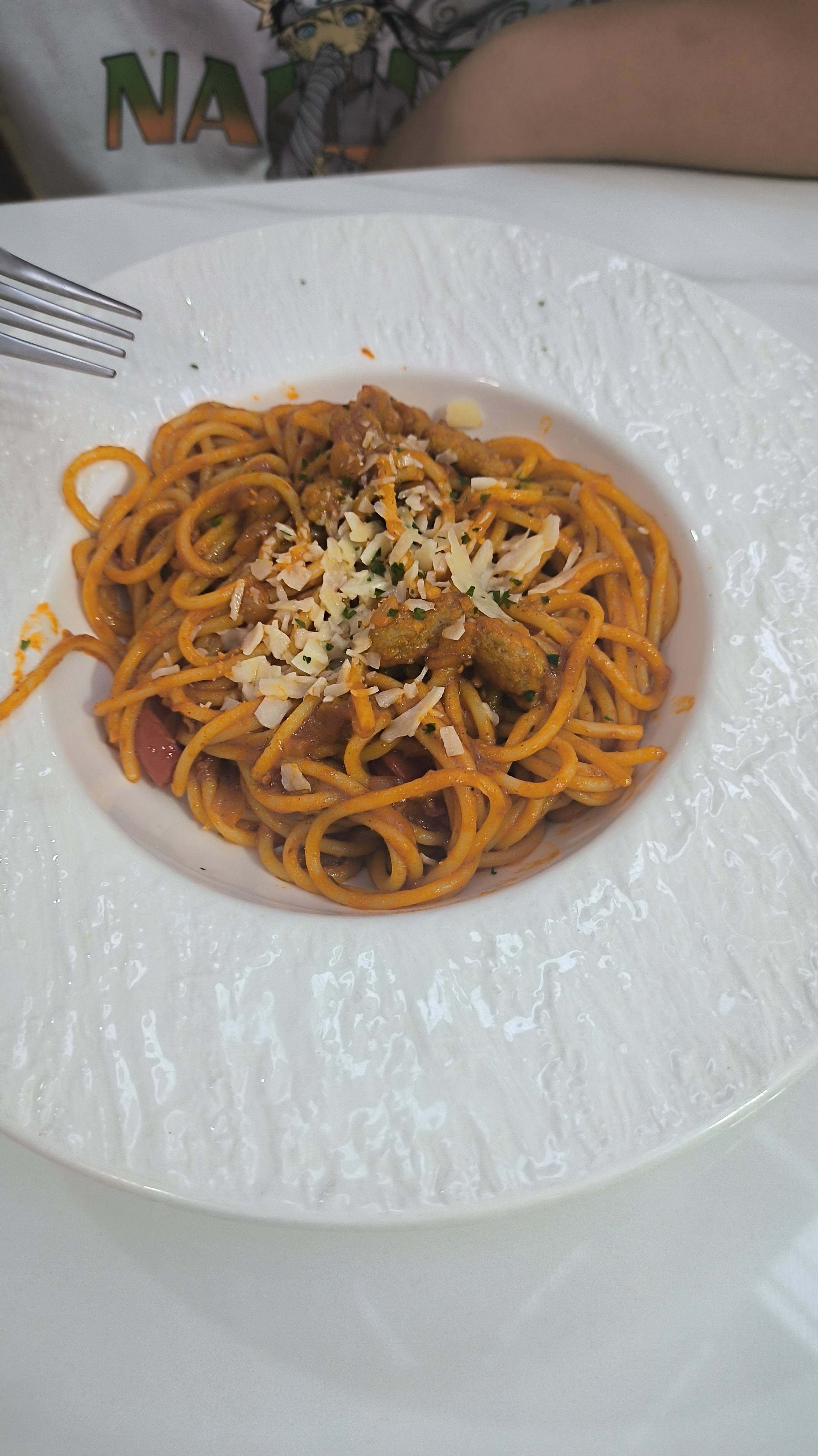 Pasta with Meat Sauce | ["pasta","ground meat","tomato sauce","cheese","herbs"] | ["pasta:300g","meat:100g","sauce:50g"] | |