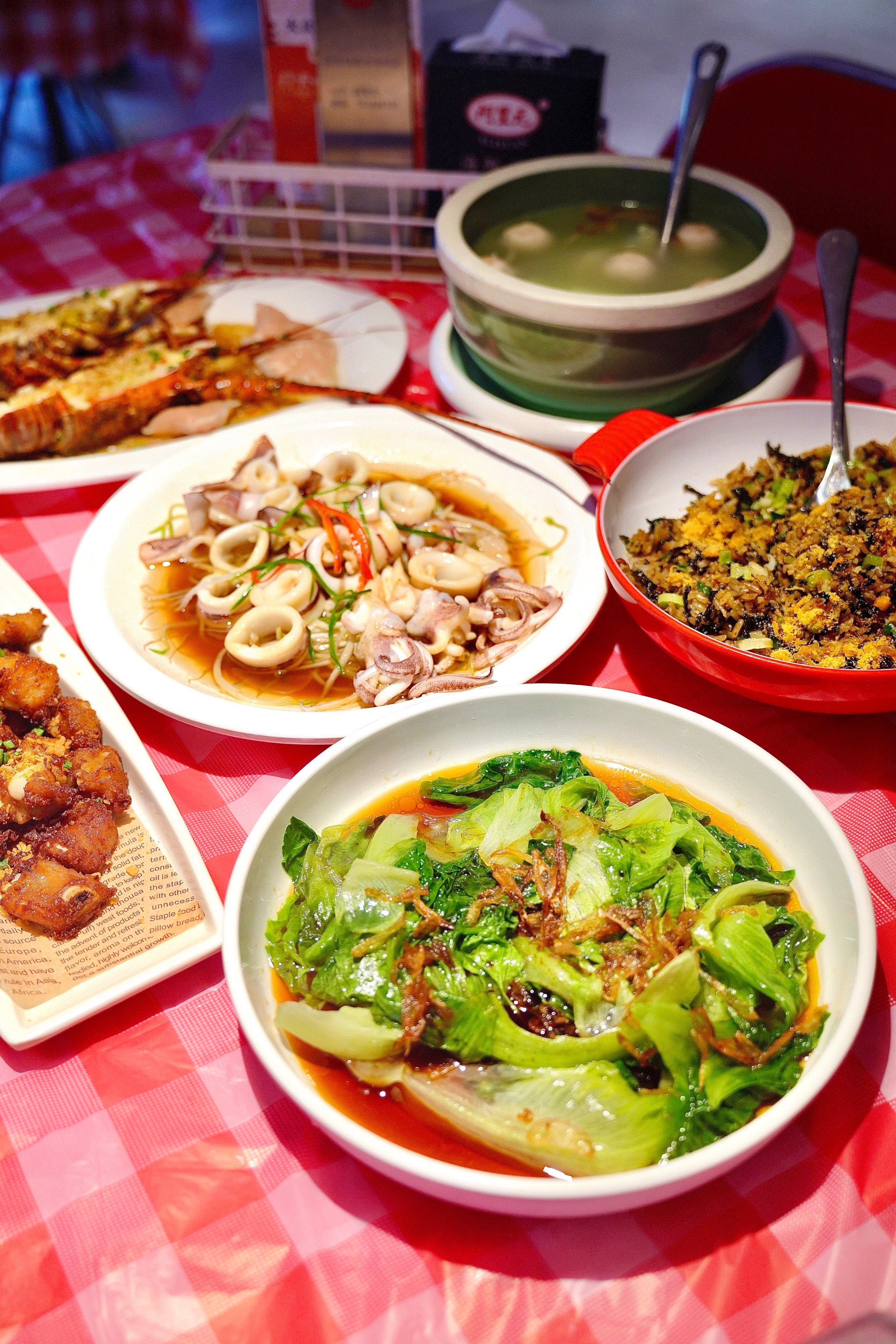 Mixed Asian Dishes | ["squid","vegetables","rice","sauce"] | ["seafood:300g","vegetables:200g","rice:150g"] | |