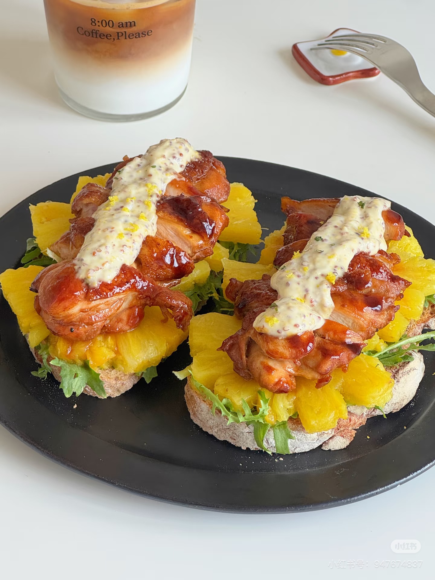 Grilled Chicken Sandwich with Pineapple | ["bread","chicken","pineapple","lettuce","sauce"] | ["bread:100g","chicken:150g","pineapple:100g","sauce:30g"] | |