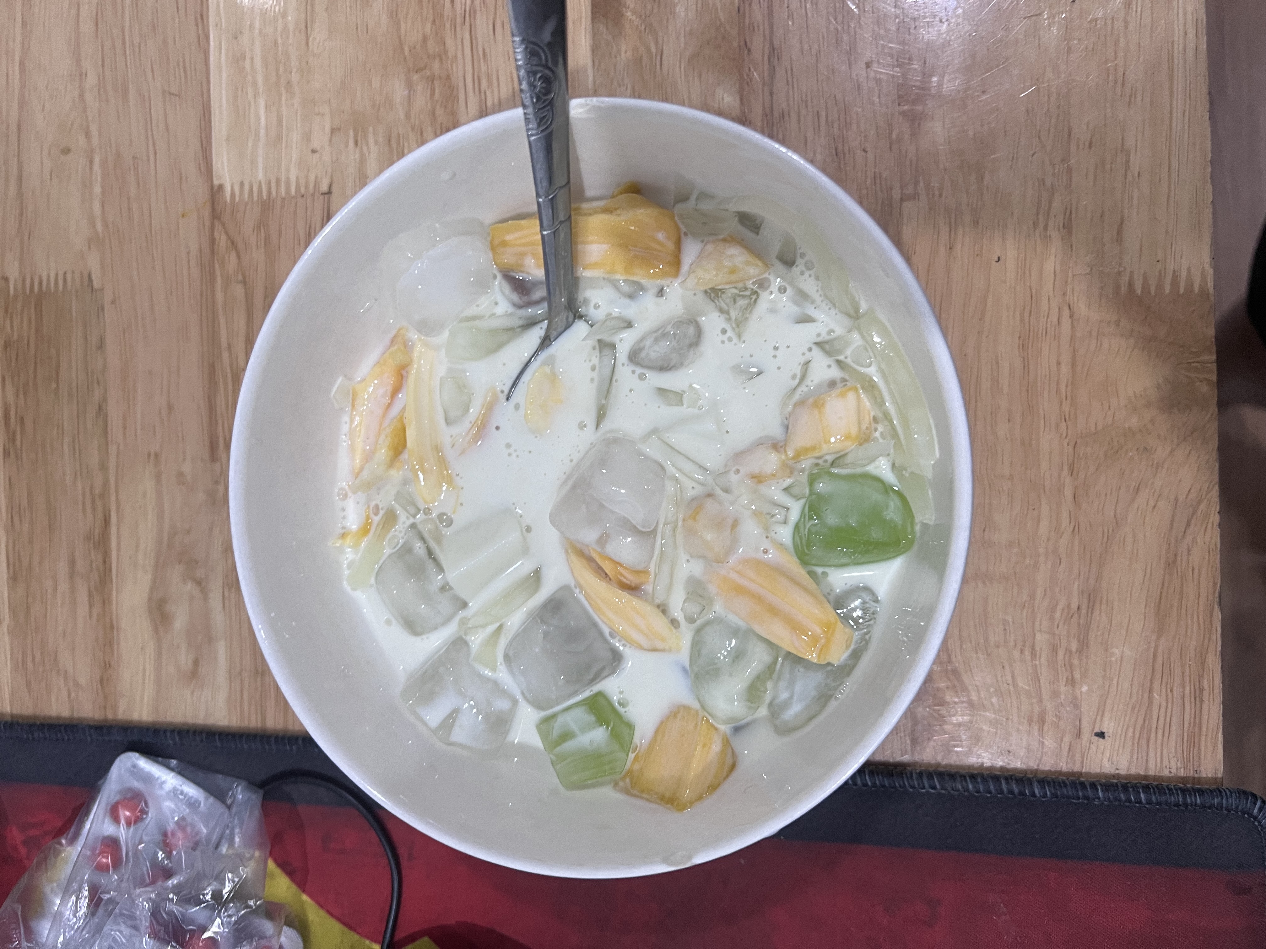 Coconut Fruit Salad | ["coconut milk","jackfruit","green jelly","ice cubes"] | ["coconut milk:200g","fruits:150g"] | |