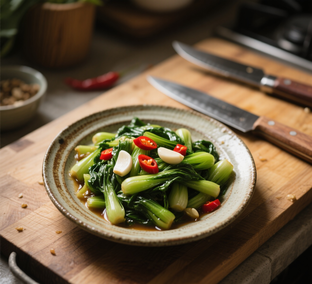 Stir-fried Greens | ["bok choy","garlic","chili"] | ["bok choy:300g","garlic:20g","chili:10g"] | |