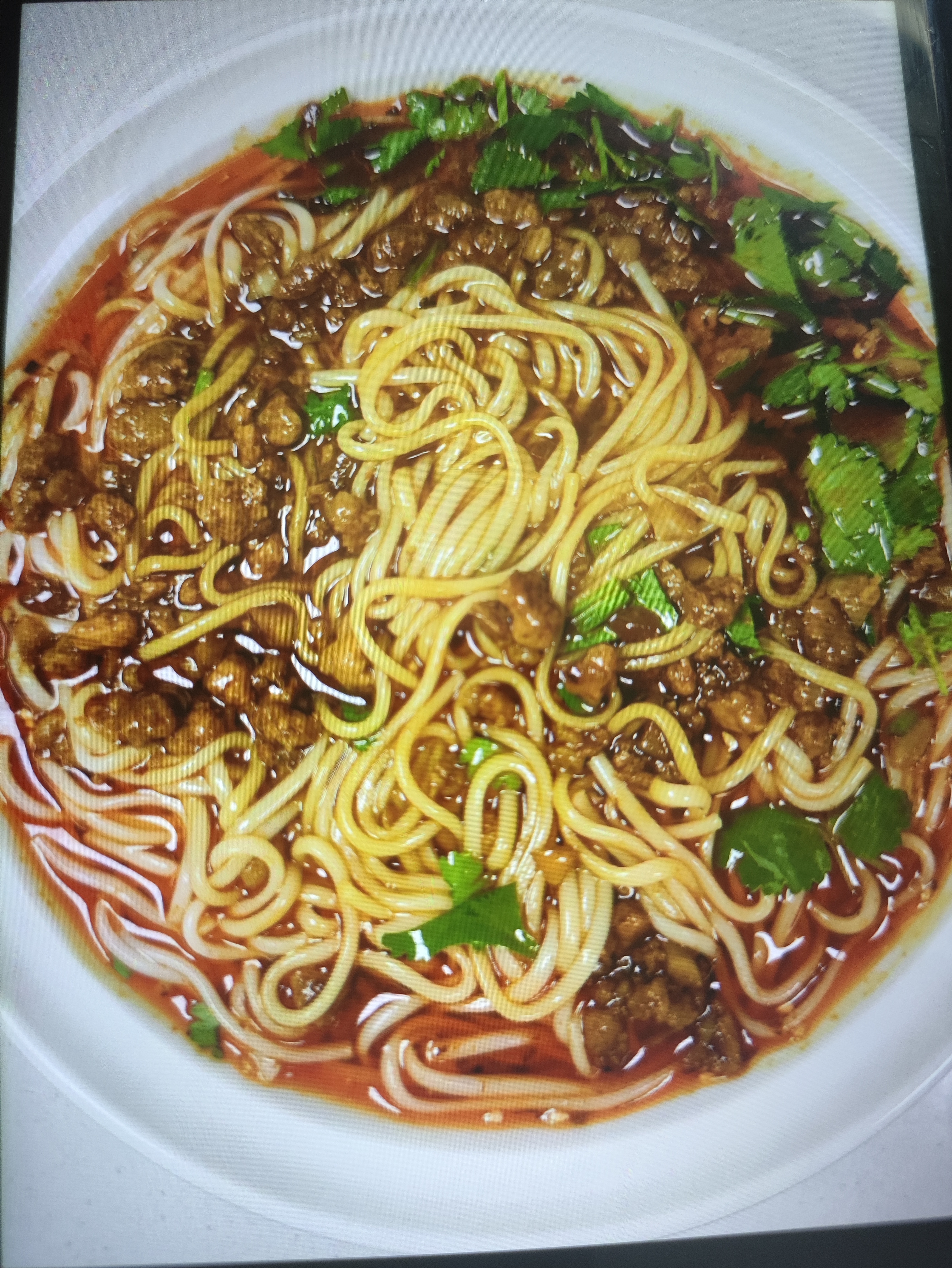 Noodle with Meat | ["noodles","ground meat","sauce","cilantro"] | ["noodles:200g","ground meat:100g","sauce:50g","herbs:10g"] | |