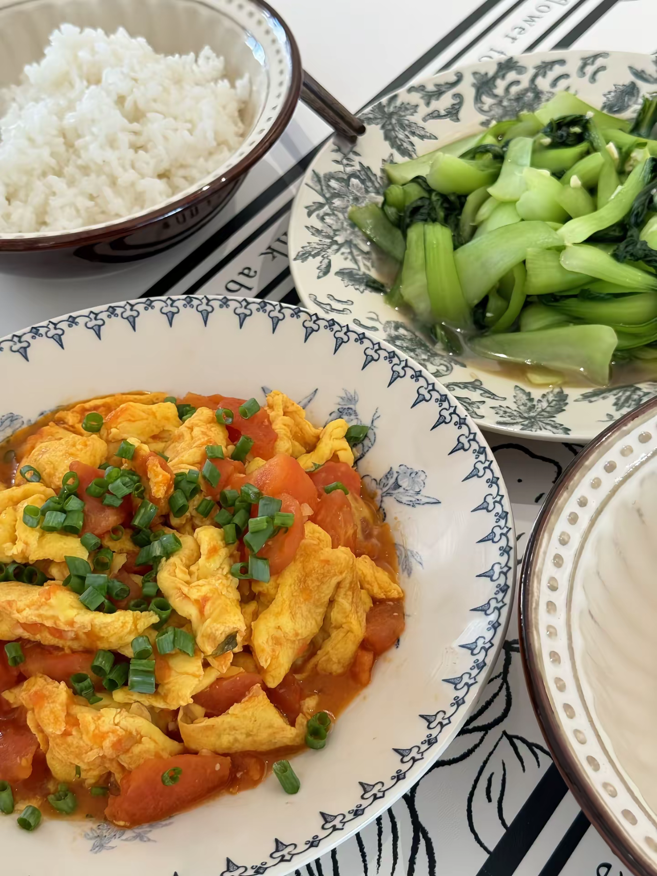 Tomato and Egg Stir-fry with Rice | ["rice","tomatoes","eggs","green onions","greens"] | ["rice:200g","tomatoes:150g","eggs:100g","greens:100g"] | |