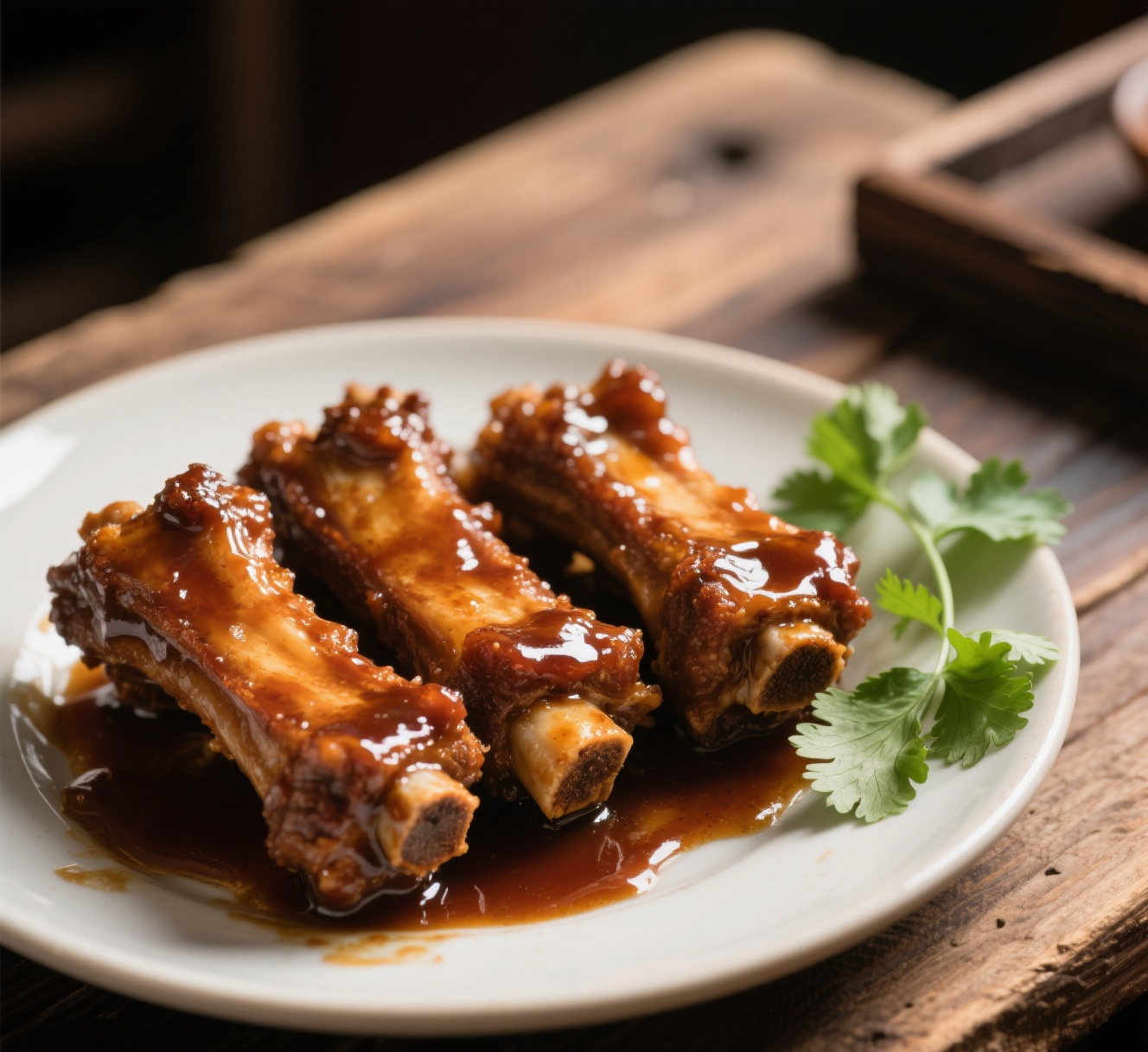 Barbecue Ribs | ["pork ribs","barbecue sauce","cilantro"] | ["ribs:300g","sauce:50g"] | |