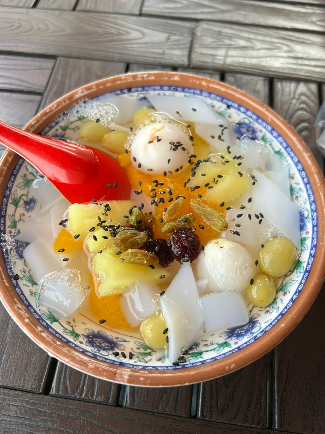 Fruit Salad with Coconut Milk | ["pineapple","lychee","coconut milk","jelly","raisins","black sesame seeds"] | ["fruit mix:300g","coconut milk:50g"] | |