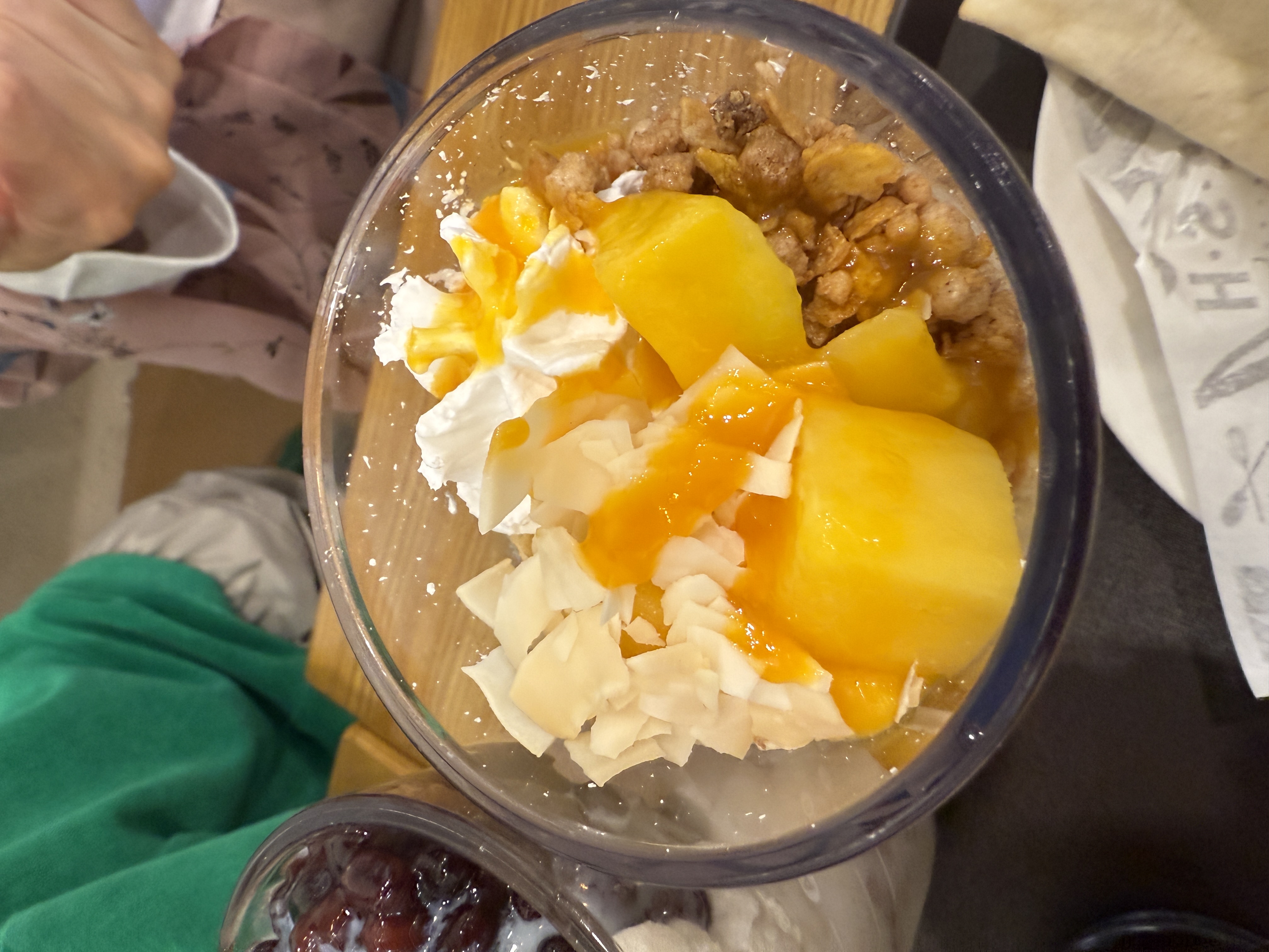 Fruit and Granola Bowl | ["mango","granola","cream","coconut flakes"] | ["mango:150g","granola:50g","cream:30g"] | |