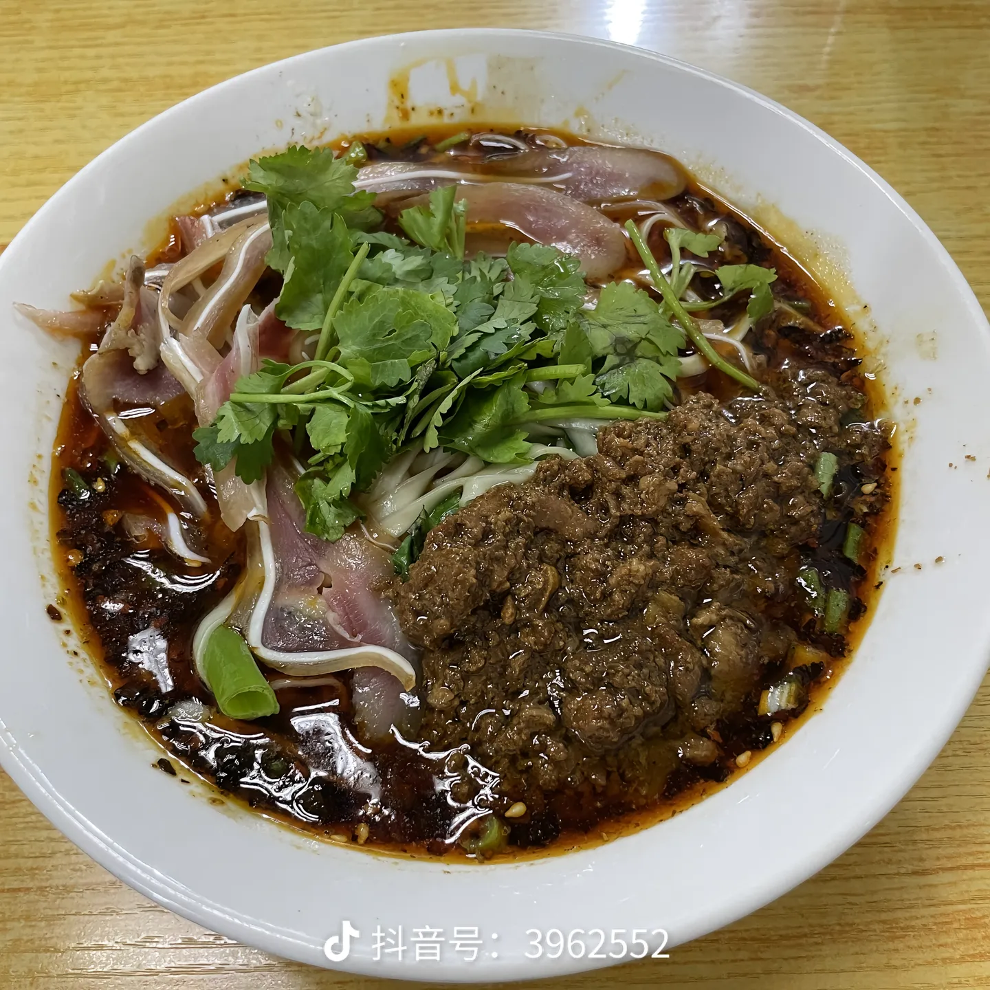 Spicy Noodle Bowl | ["noodles","ground meat","cilantro","sliced meat","spices"] | ["noodles:200g","meat:150g","vegetables:50g"] | |