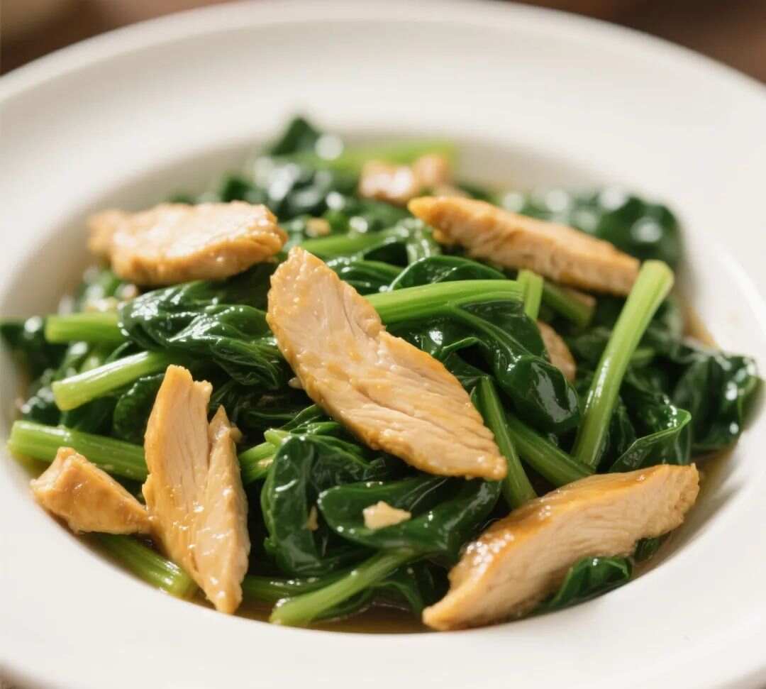 Stir-fried Chicken with Greens | ["chicken","spinach","soy sauce","garlic"] | ["chicken:200g","greens:150g"] | |