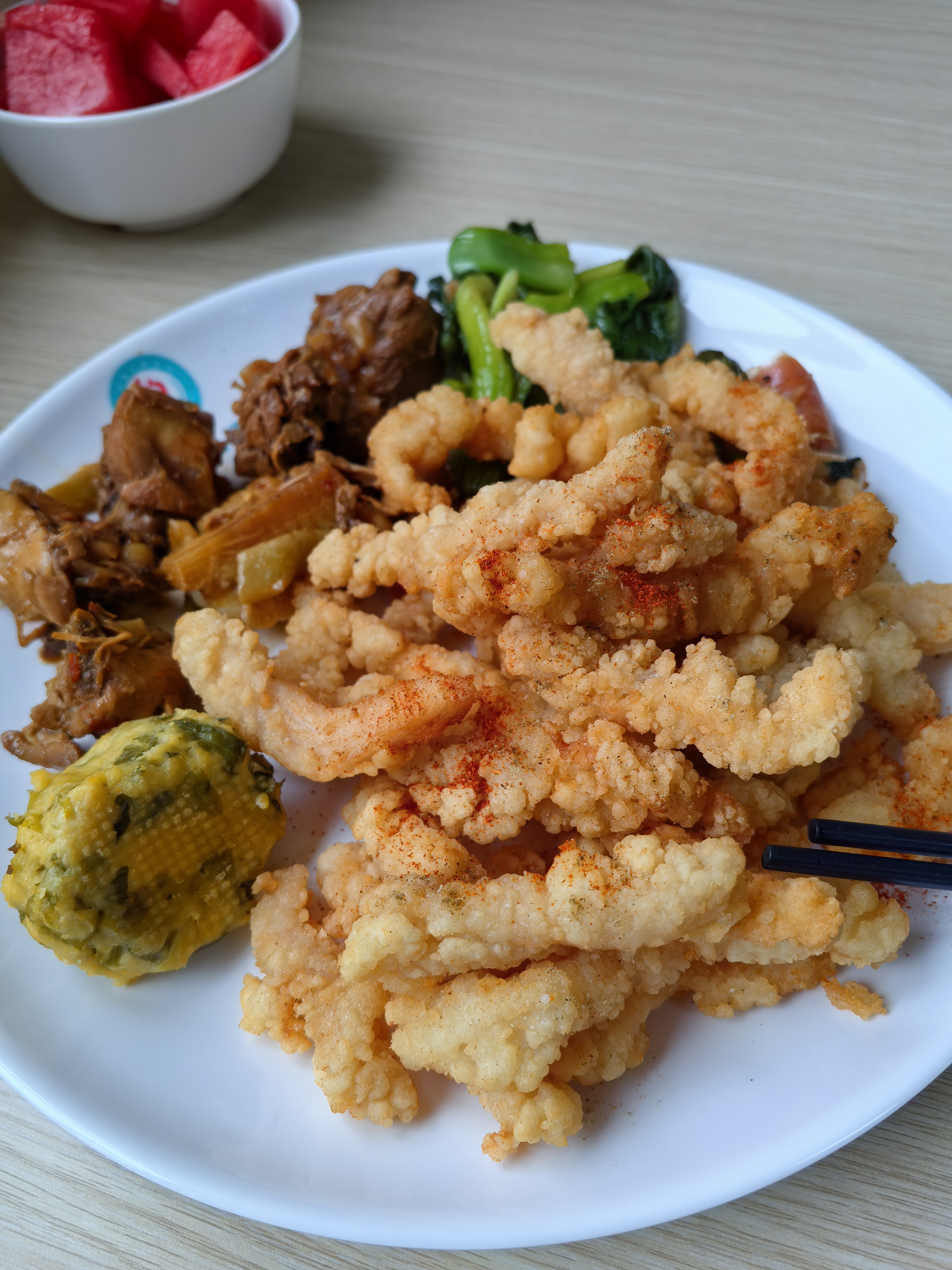 Fried seafood platter with sides | ["fried seafood","chicken","broccoli","sauce","corn"] | ["fried seafood:300g","chicken:150g","vegetables:100g","sauce:50g"] | |