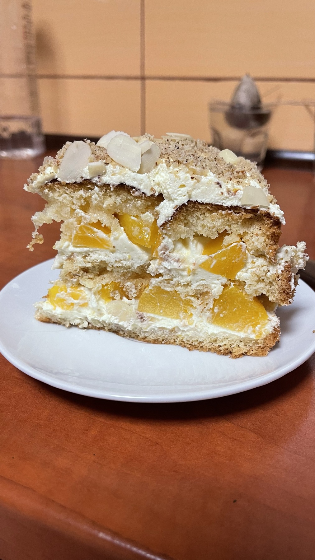 Fruit Layer Cake | ["cake","cream","peaches","almonds"] | ["cake:150g"] | |