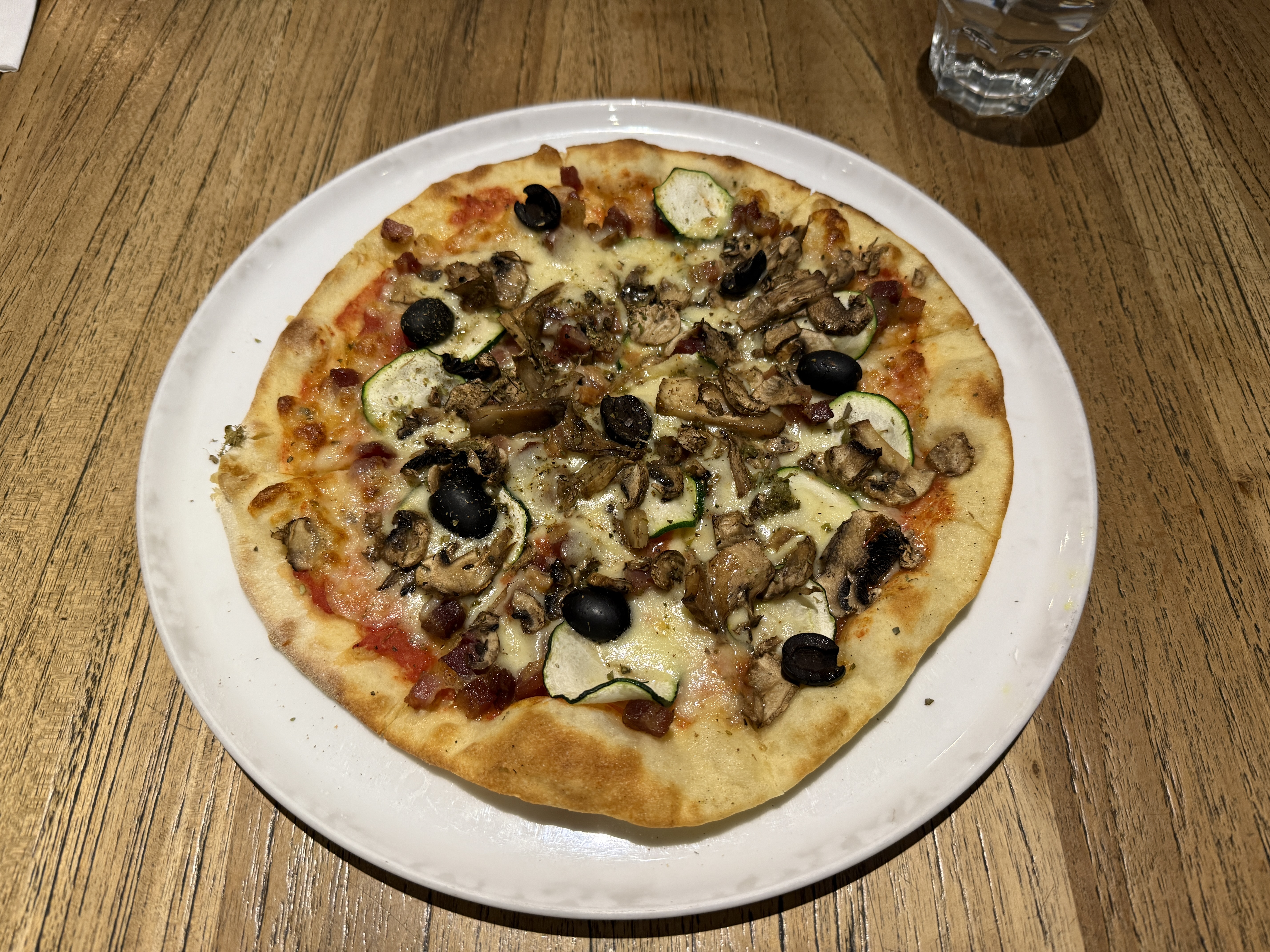 Vegetable Pizza | ["pizza dough","tomato sauce","mozzarella cheese","zucchini","mushrooms","black olives"] | ["pizza:300g"] | |