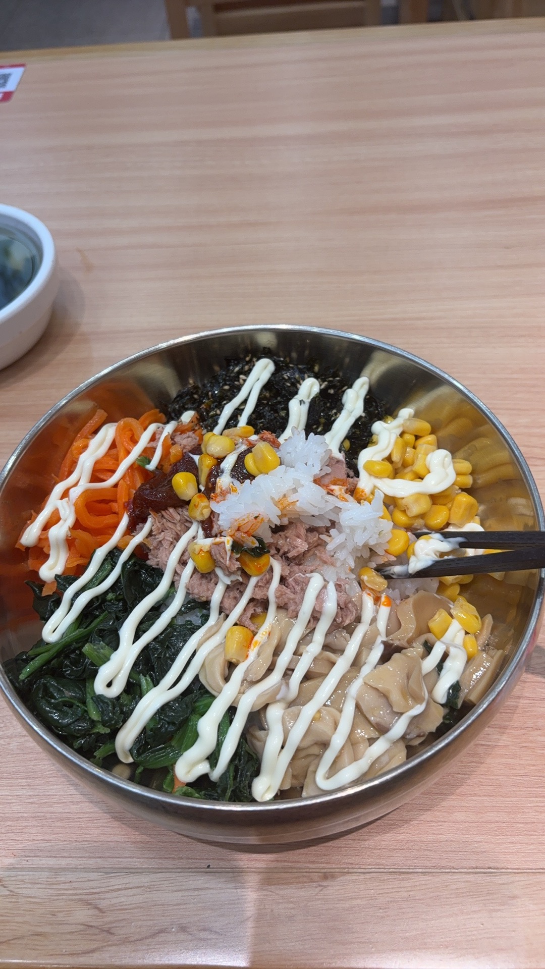 Mixed Rice Bowl | ["rice","tuna","spinach","carrots","corn","mayonnaise"] | ["rice:200g","tuna:100g","spinach:50g","carrots:50g","corn:50g","mayonnaise:30g"] | |
