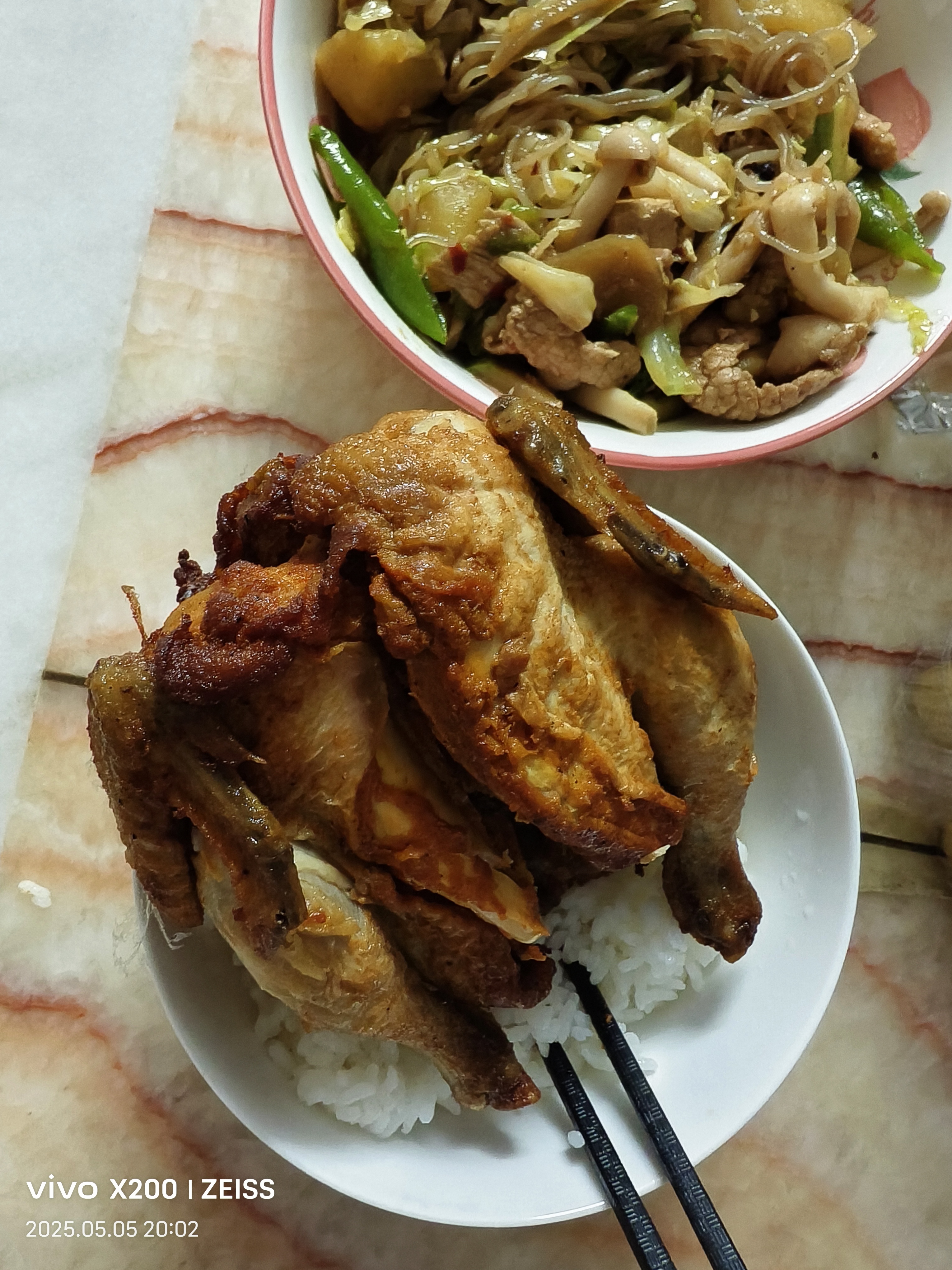 Fried Chicken with Rice and Noodles | ["fried chicken","rice","noodles","vegetables"] | ["chicken:300g","rice:150g","noodles:100g"] | |