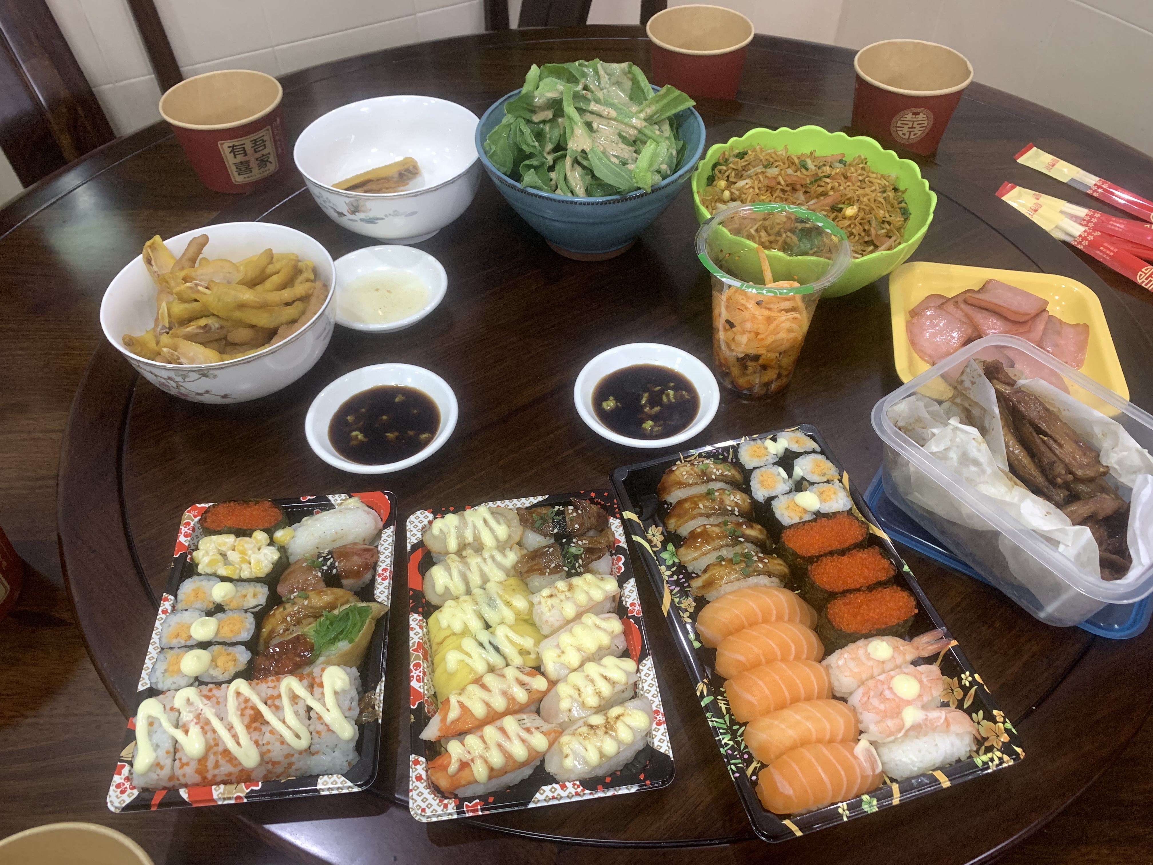 Sushi and Noodles | ["sushi","noodles","vegetables","sauce"] | ["sushi:500g","noodles:200g","vegetables:150g"] | |