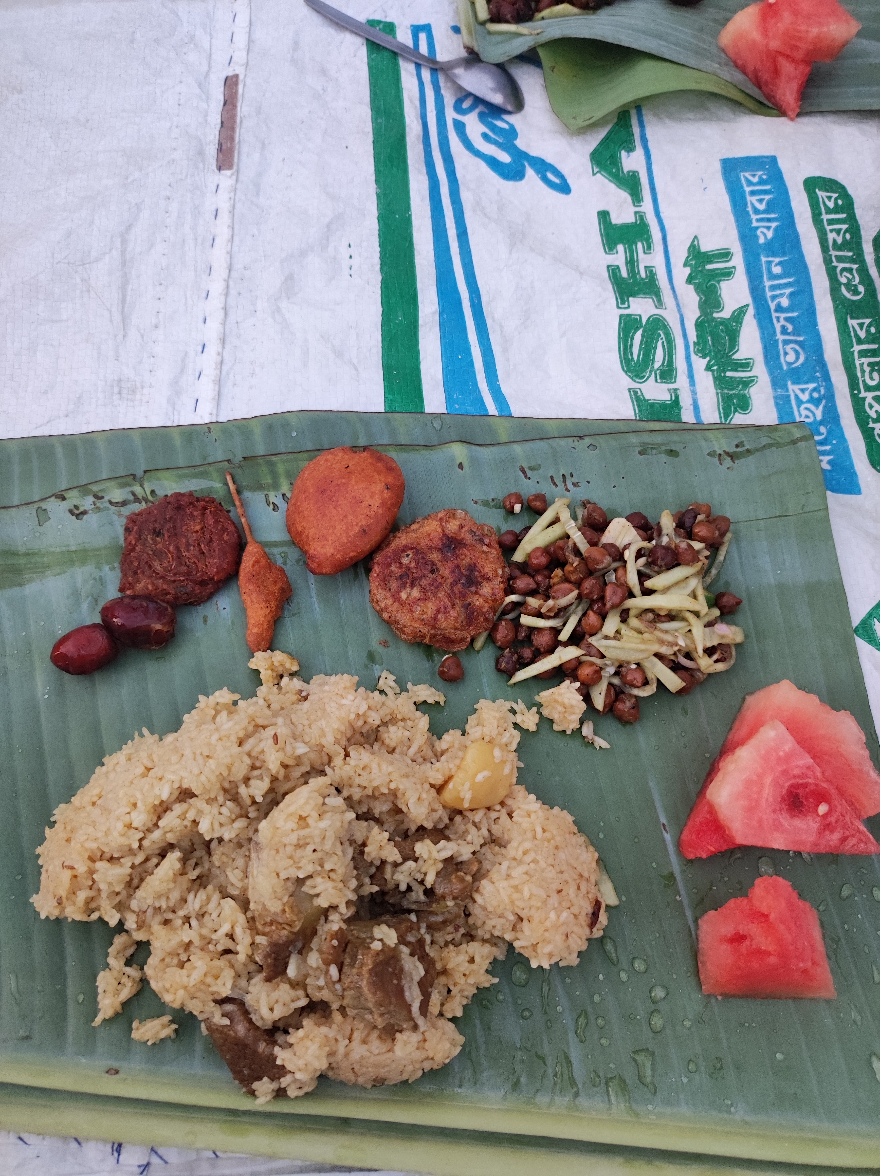 Mixed Rice Platter | ["rice","meat","fried lentil balls","watermelon","spices"] | ["rice:300g","meat:100g","fried items:100g","watermelon:150g"] | |