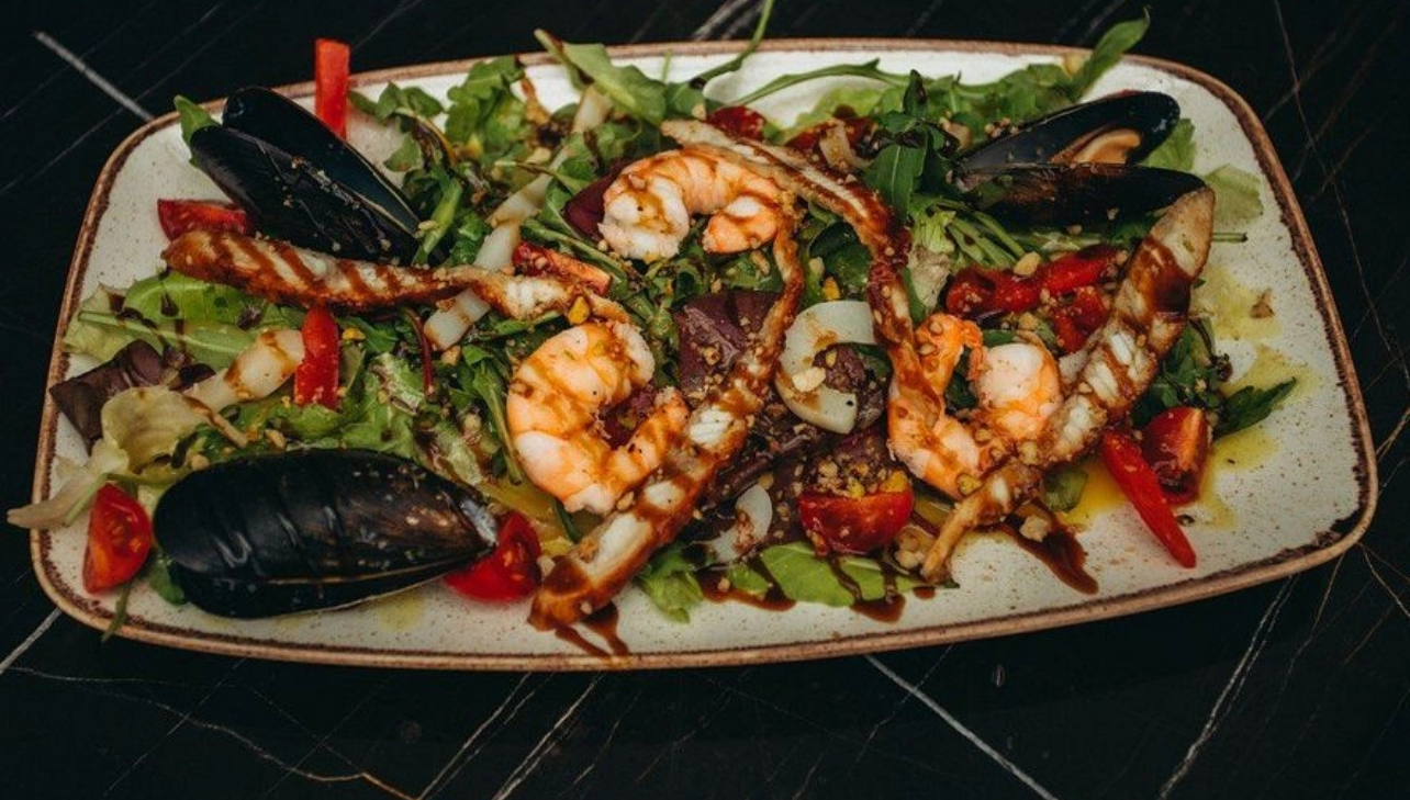 Seafood Salad | ["shrimp","mussels","salad greens","tomatoes","dressing"] | ["shrimp:150g","salad greens:200g","mussels:100g"] | |