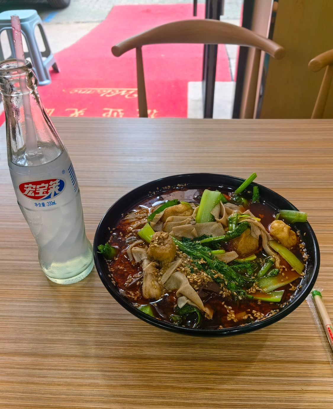 Fried Noodles with Soup and Vegetables | ["fried noodles","vegetables","soup broth"] | ["noodles:300g","soup:200g","vegetables:150g"] | |