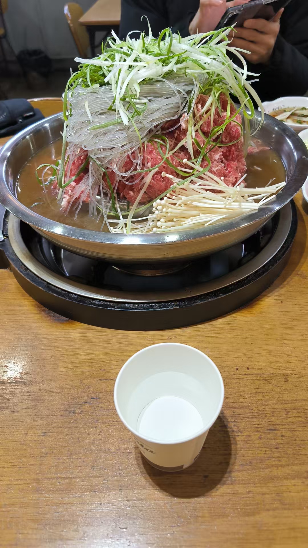 Beef Hot Pot | ["beef","glass noodles","green onions","enoki mushrooms"] | ["beef:300g","noodles:150g","vegetables:100g"] | |