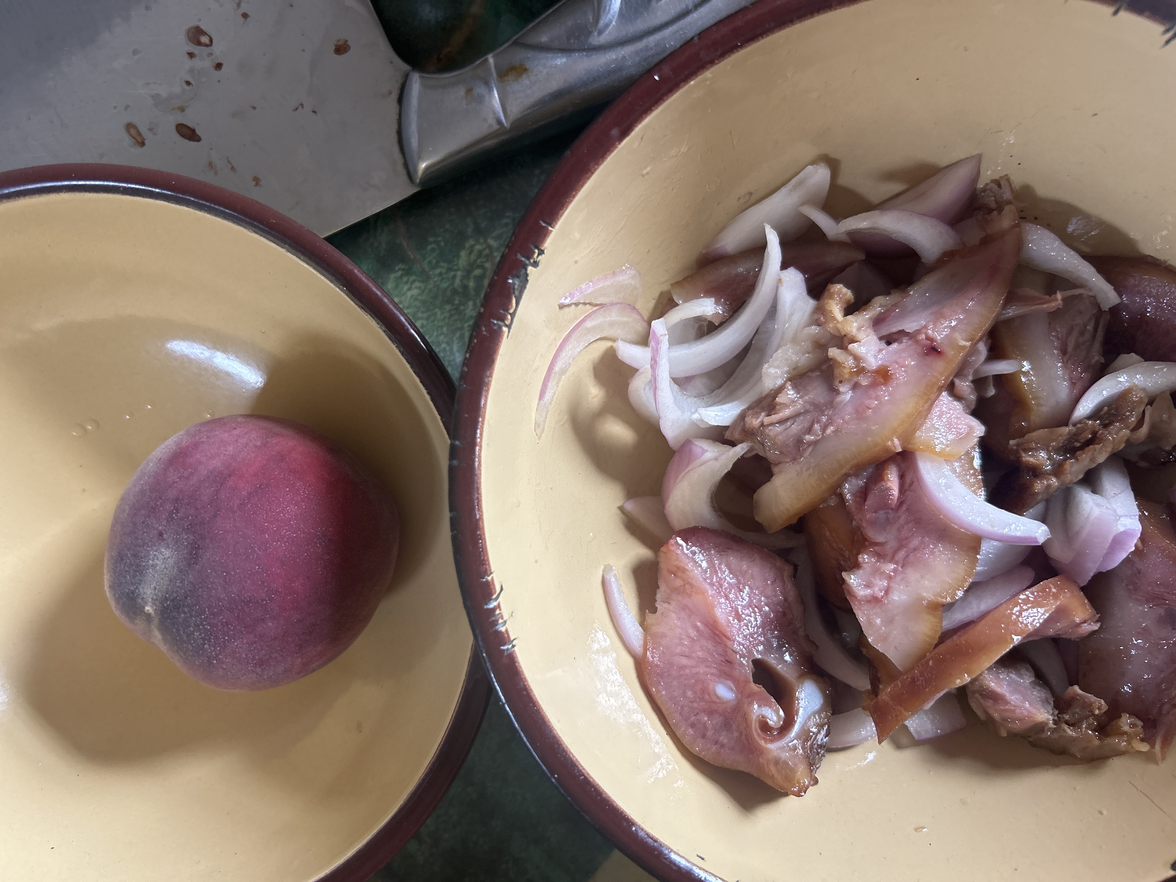 Meat and Onion Salad | ["meat","onion","peach"] | ["meat:300g","onion:50g","peach:100g"] | |