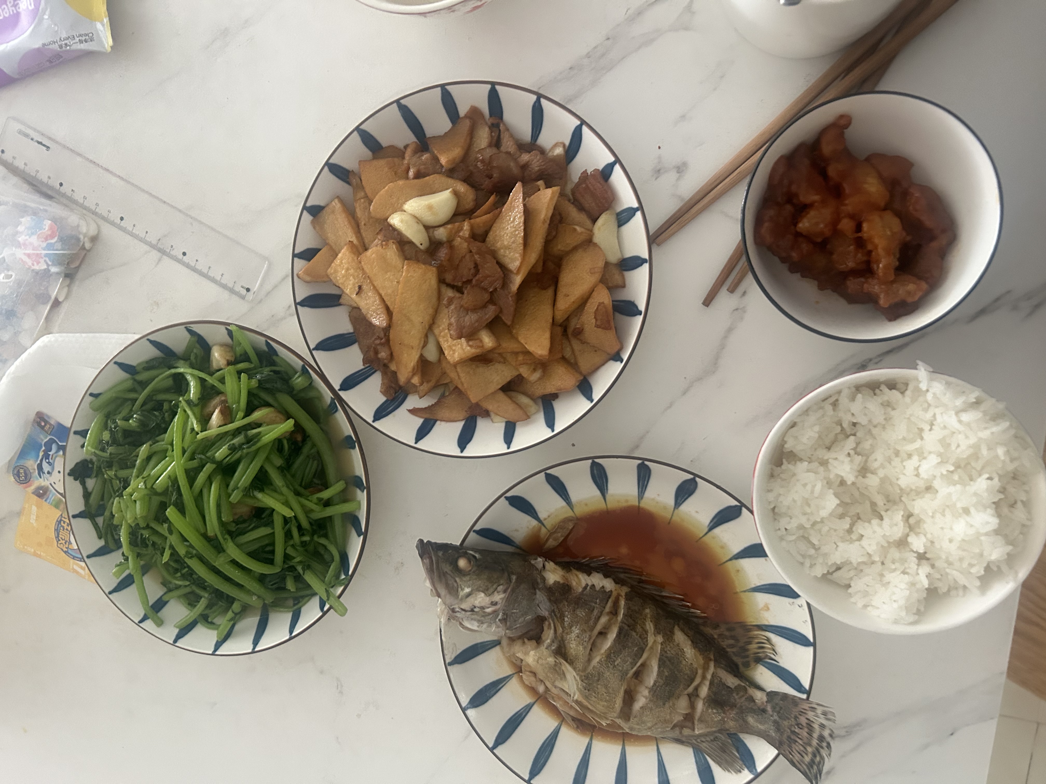 Mixed Asian Meal | ["rice","fish","green vegetables","pork","potatoes"] | ["rice:200g","fish:150g","vegetables:100g","meat:150g"] | |
