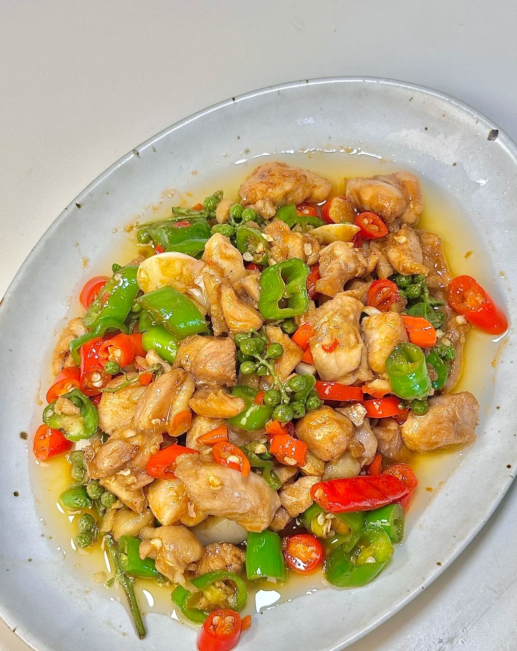 Spicy Stir-Fried Chicken | ["chicken","green peppers","red peppers","onions","spices"] | ["chicken:200g","vegetables:150g"] | |