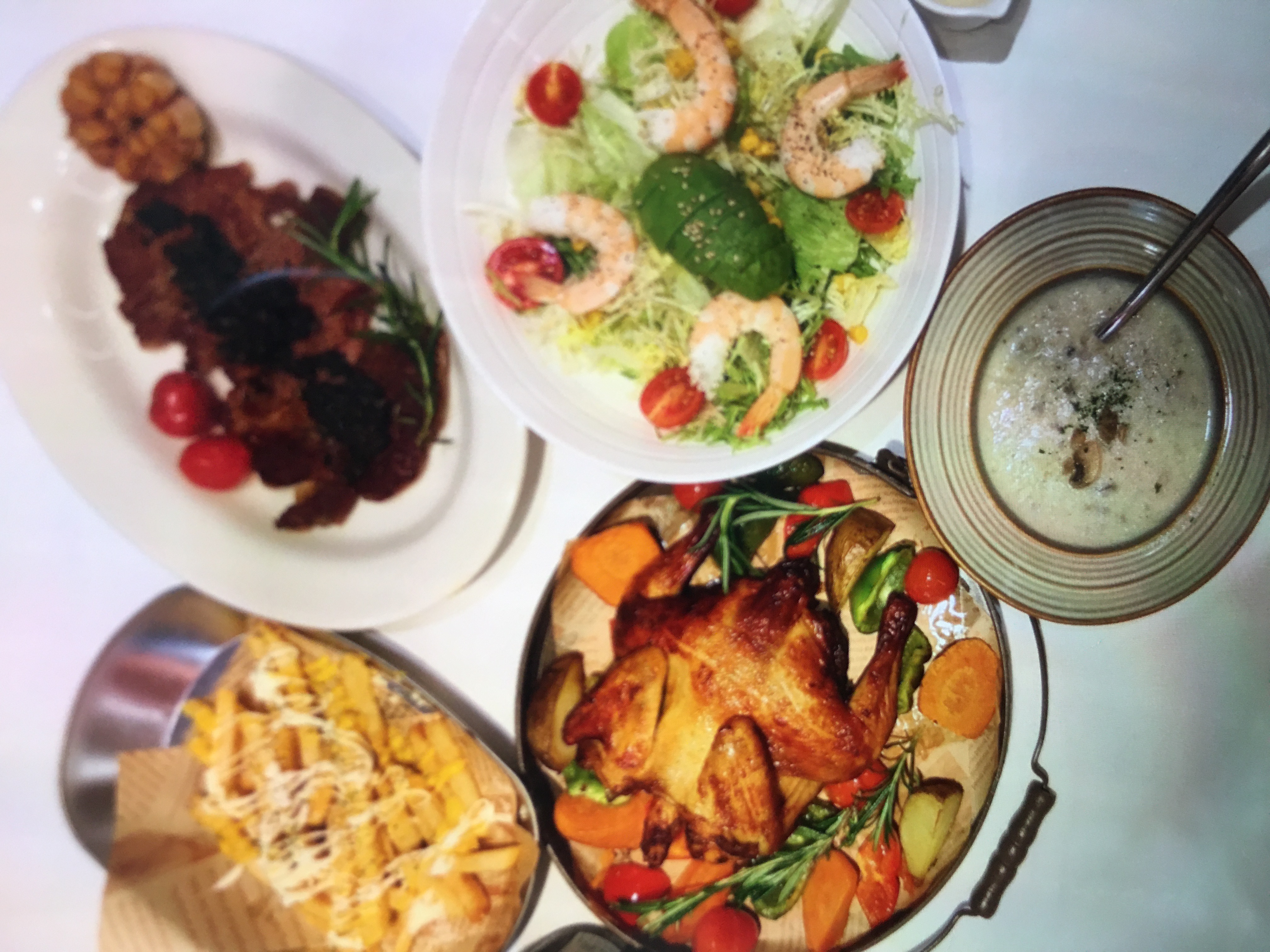 Mixed Platter | ["chicken","shrimp","lettuce","tomatoes","fries","soup"] | ["chicken:300g","shrimp:150g","salad:200g","fries:150g","soup:200g"] | |