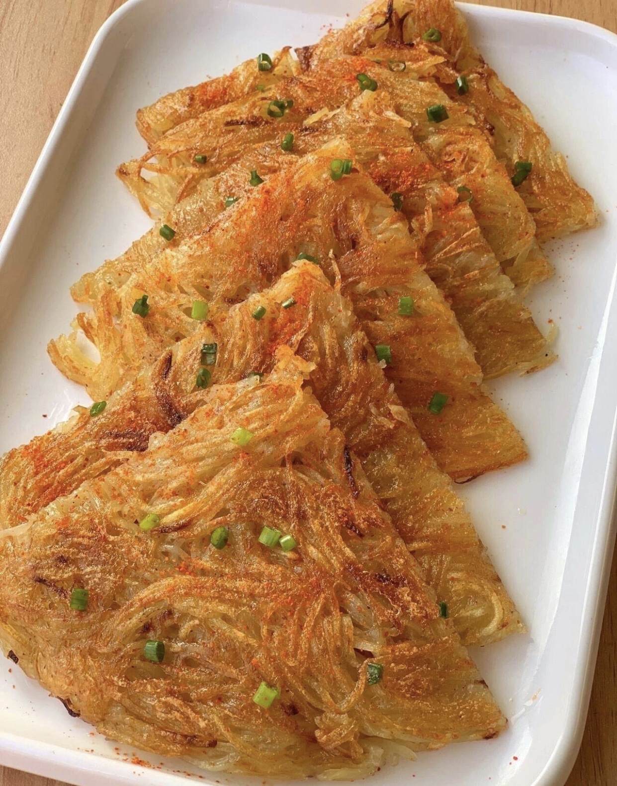 Crispy Potato Pancakes | ["potatoes","oil","green onions","spices"] | ["potatoes:300g","oil:30g","green onions:10g"] | |