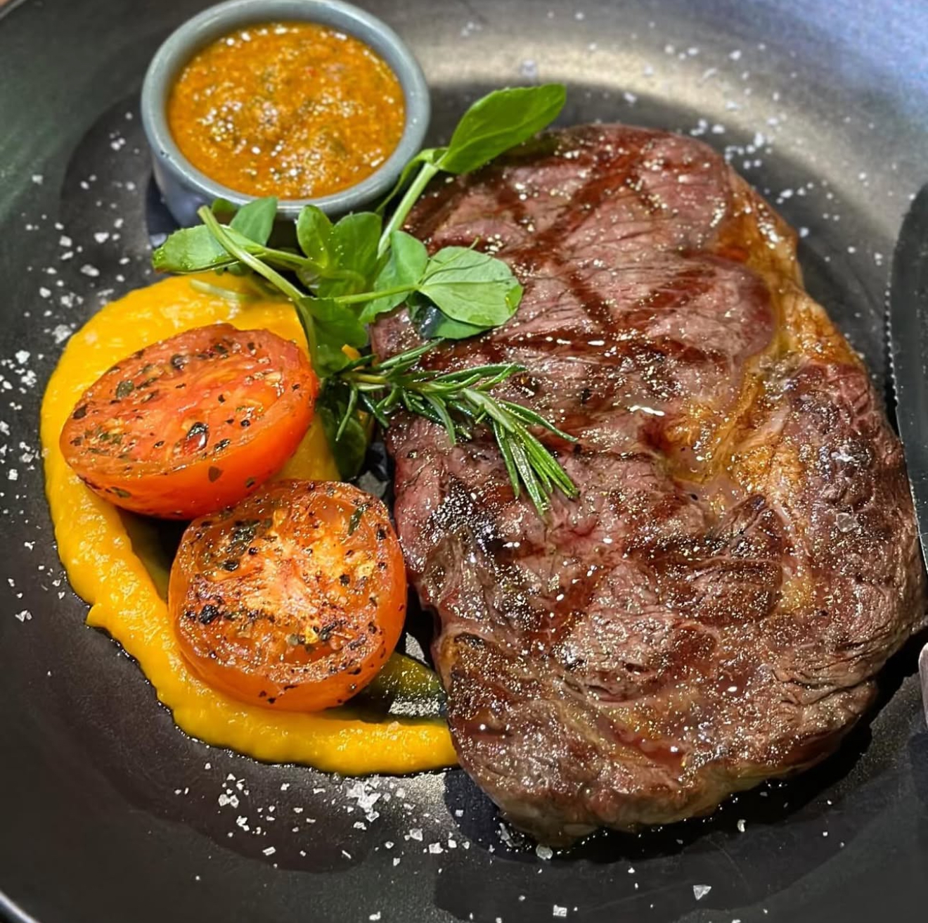 Grilled Steak with Vegetables | ["steak","roasted tomatoes","puree","herbs"] | ["steak:250g","roasted tomatoes:100g","puree:100g"] | |