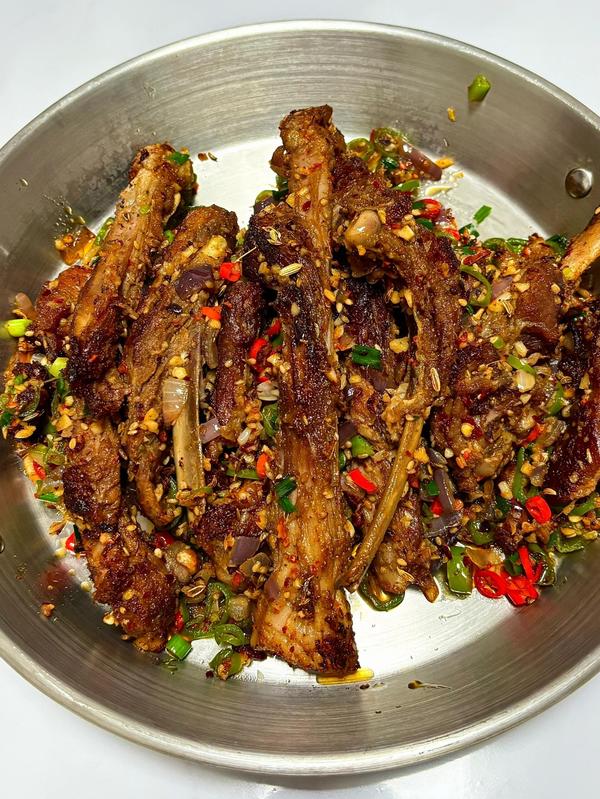 Spicy Grilled Ribs | ["ribs","green peppers","red peppers","spices"] | ["ribs:400g","vegetables:100g"] | |