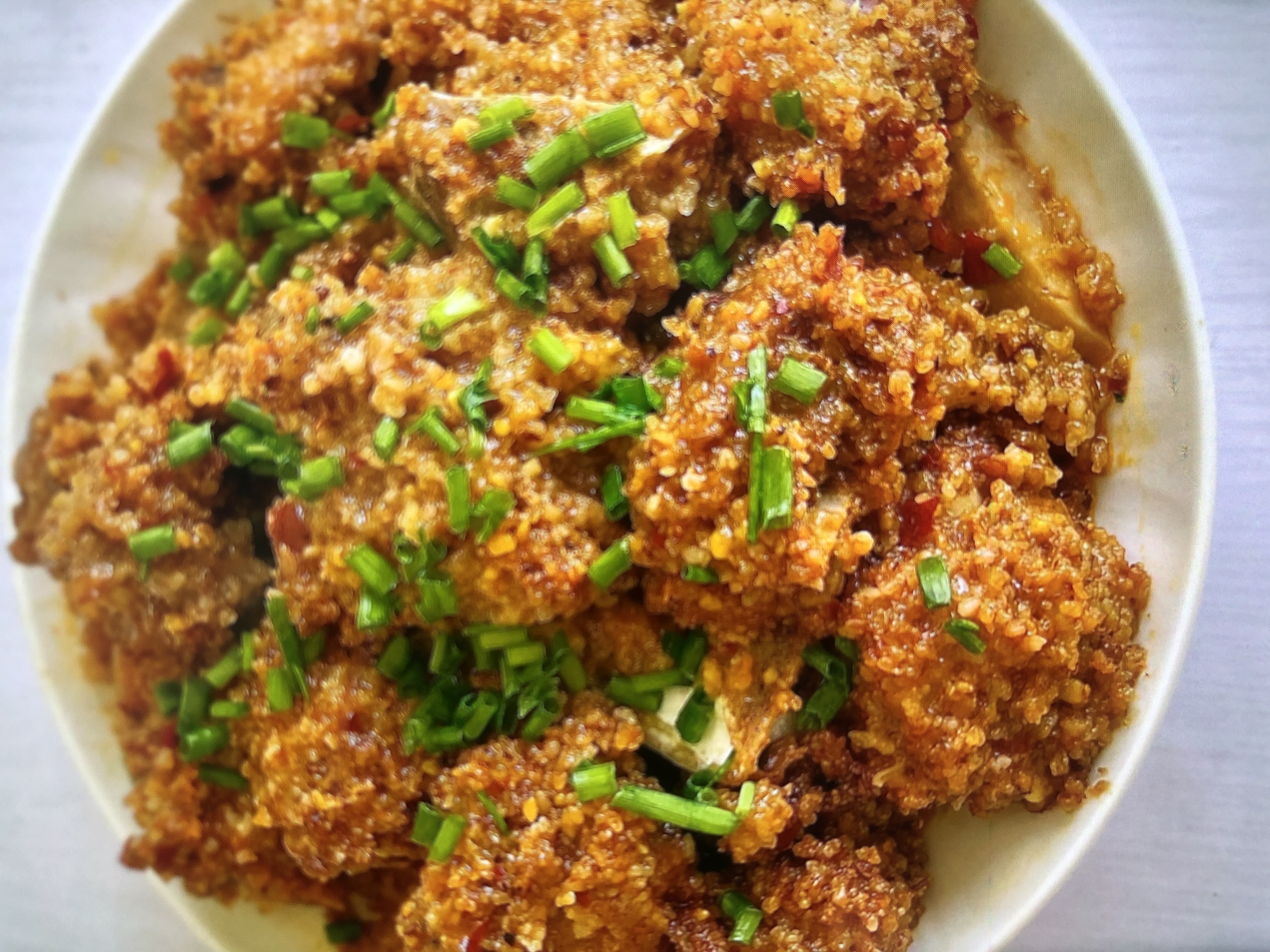 Crispy Quinoa Chicken | ["quinoa","chicken","green onions","spices"] | ["quinoa:200g","chicken:150g","green onions:20g"] | |