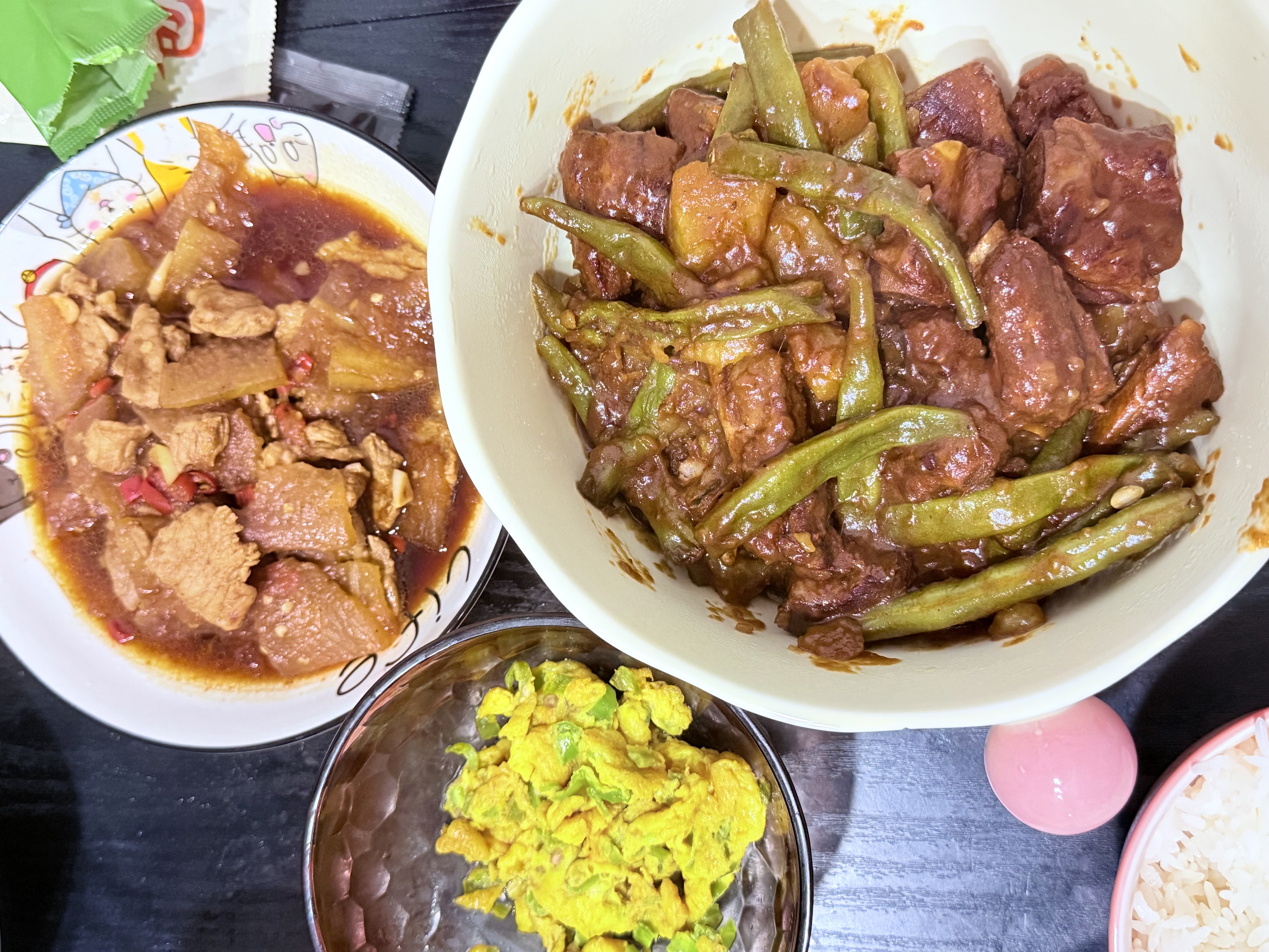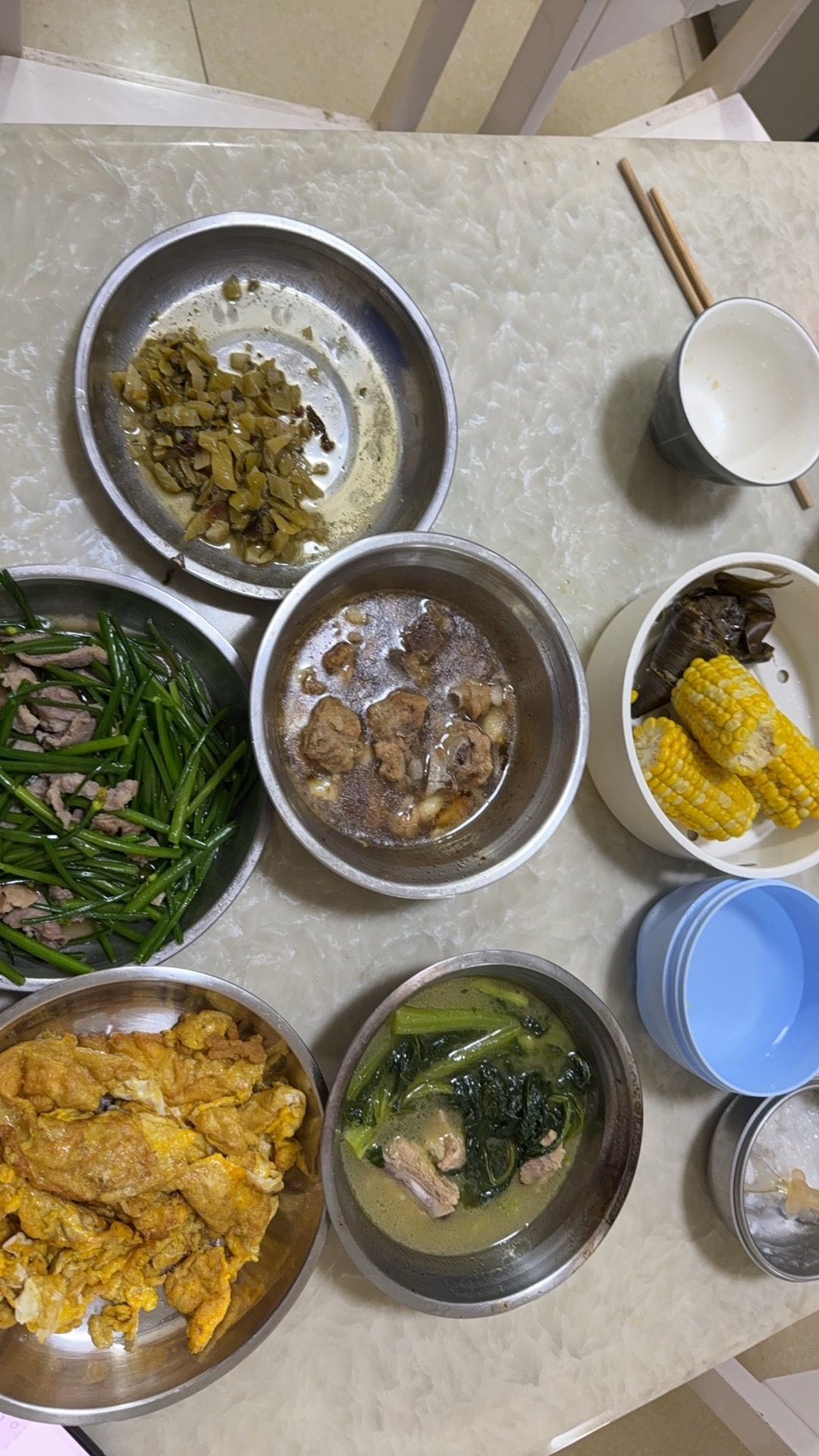 Mixed Home-Cooked Meal | ["pork","egg","green vegetables","corn","seasoning"] | ["pork:200g","egg:150g","vegetables:200g","corn:100g"] | |