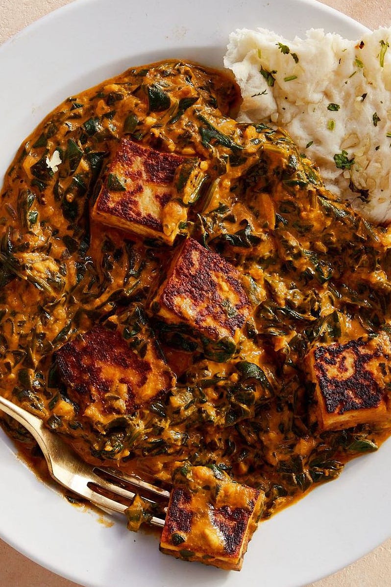 Creamy Spinach and Tofu | ["tofu","spinach","cream","mashed potatoes"] | ["tofu:200g","spinach:150g","mashed potatoes:200g"] | |